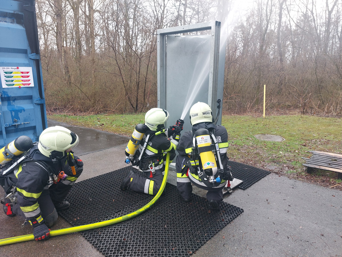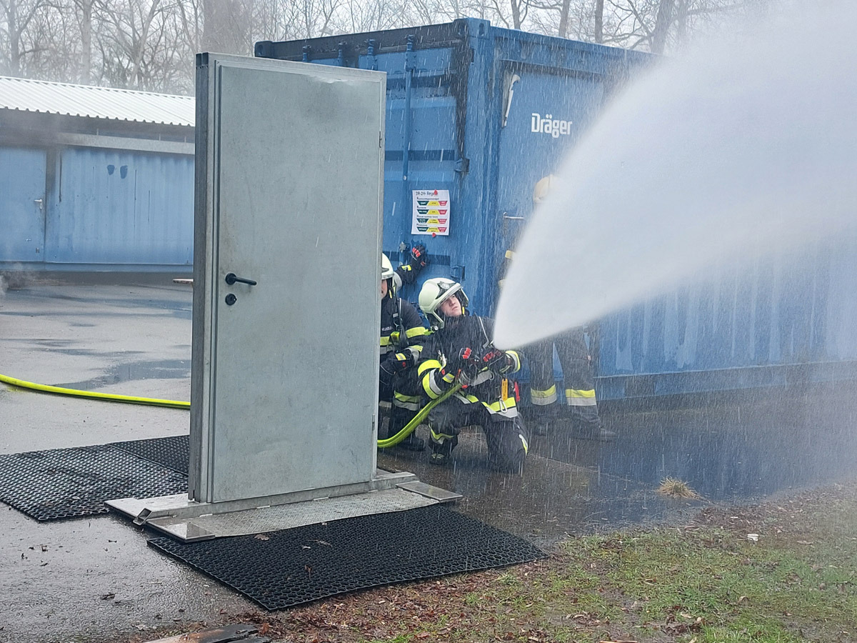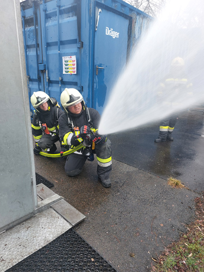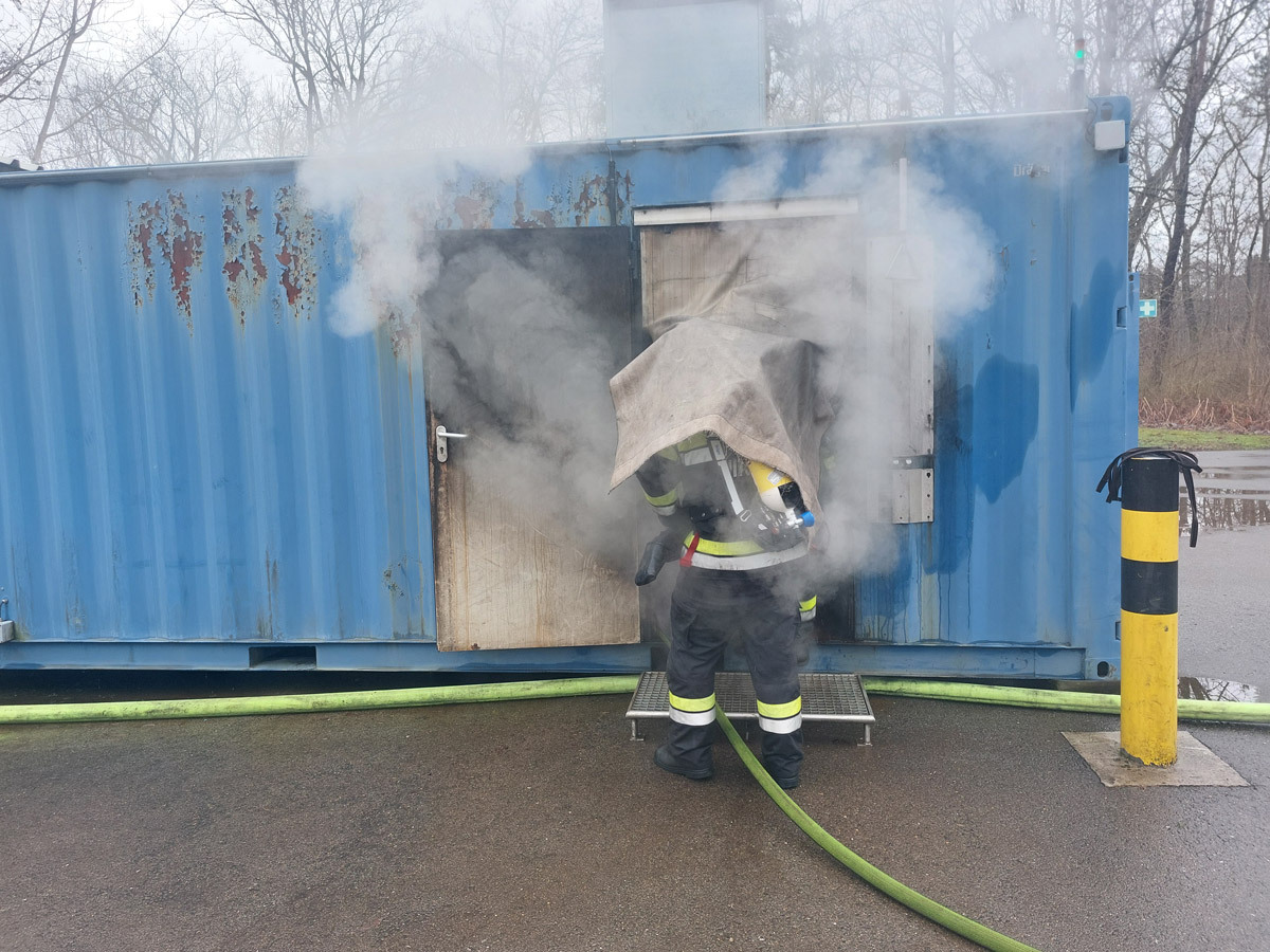 Bei Station zwei wurde das Hohlstrahlrohr im „Trockenen“ beübt, ehe es in Station drei bei einem realitätsnah hergestellten Zimmerbrand (durch Verbrennen von Gas) und Temperaturen von bis zu 500° C eingesetzt wurde.