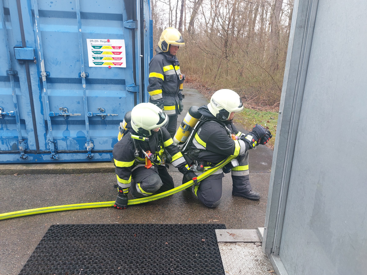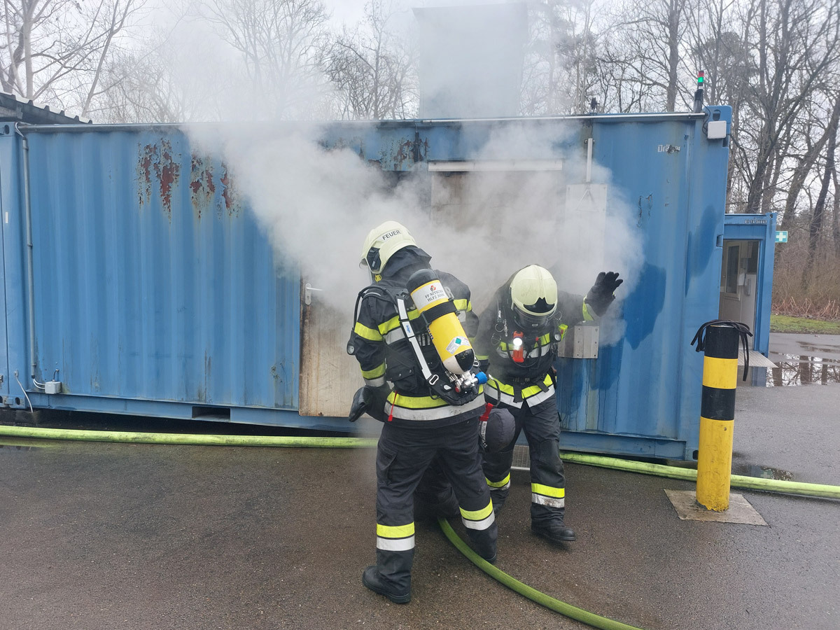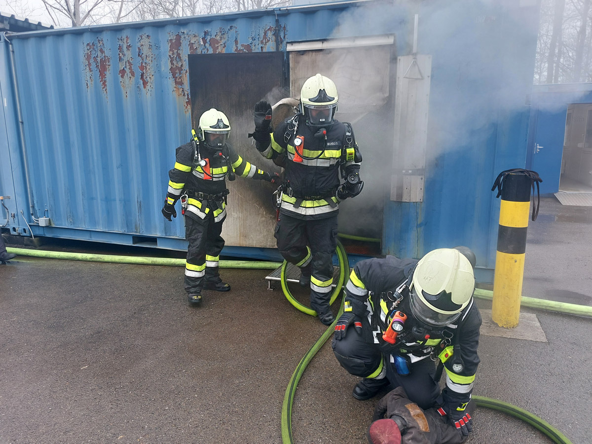 Bei Station zwei wurde das Hohlstrahlrohr im „Trockenen“ beübt, ehe es in Station drei bei einem realitätsnah hergestellten Zimmerbrand (durch Verbrennen von Gas) und Temperaturen von bis zu 500° C eingesetzt wurde.