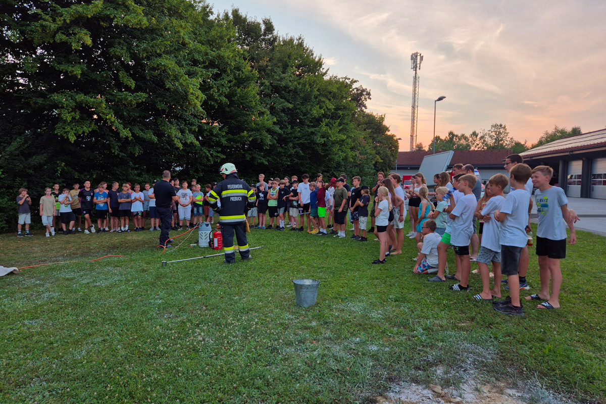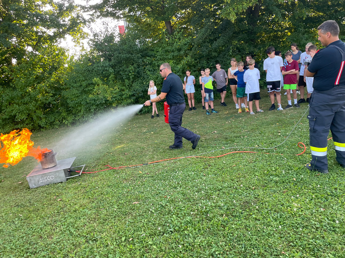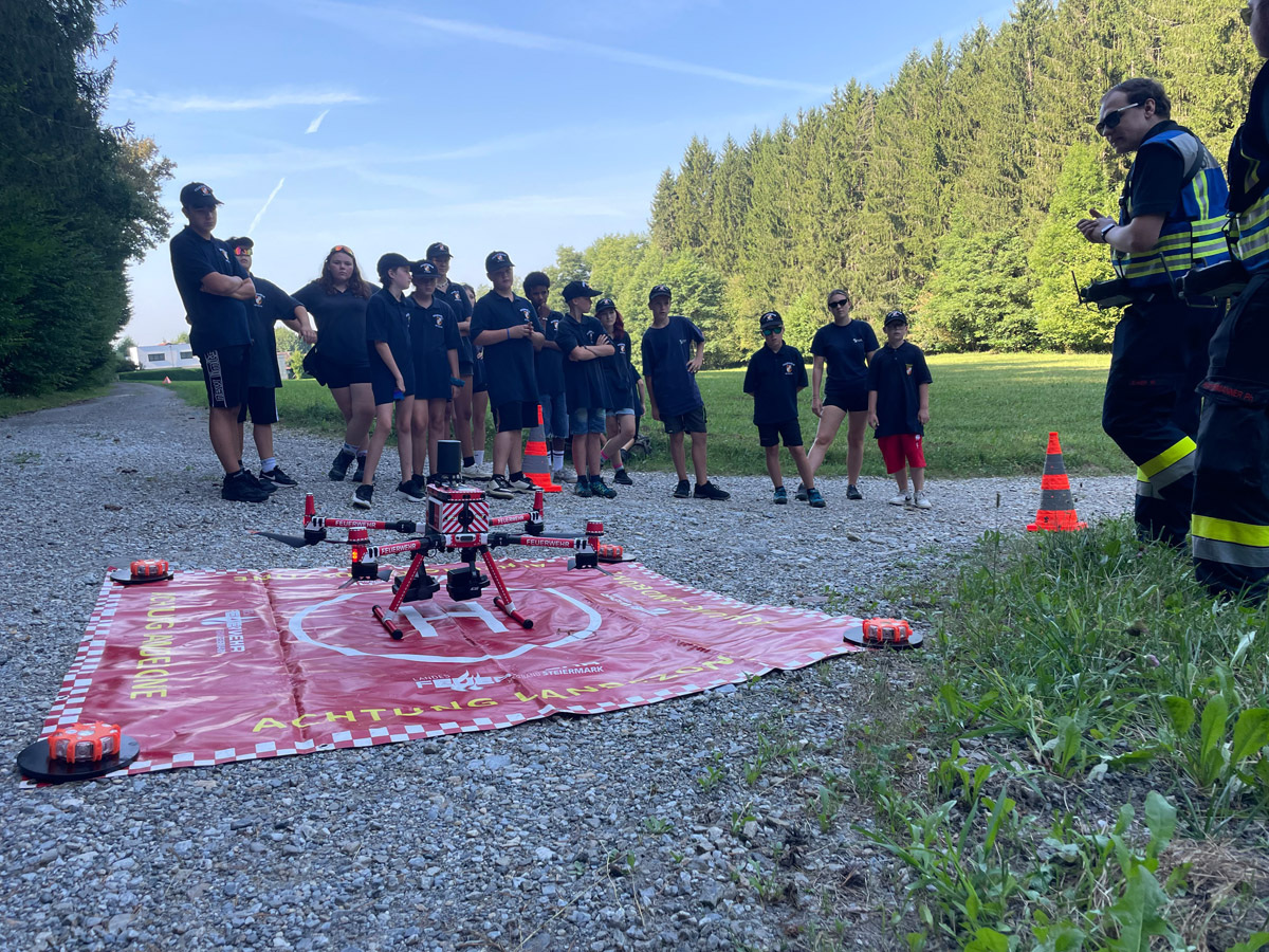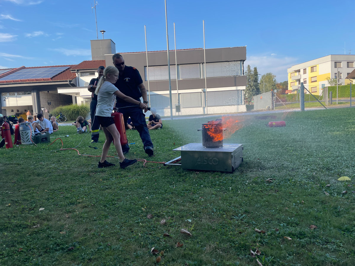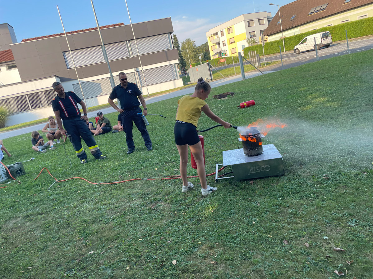 Auch sonst wurde das Rahmenprogramm interessant und spielerisch gestaltet. So durften die Mädels und Burschen im Zuge einer Vorstellung des Themas „Entstehungsbrandbekämpfung“ die richtige Handhabung verschiedener Feuerlöscher kennenlernen und selbst anwenden. Das Rote Kreuz Gleisdorf kam zu Besuch und gab einen Einblick in das Thema der Ersten Hilfe und der Zusammenarbeit zwischen Feuerwehr- und Rettungswesen. Weiters wurden auch die Drehleiter der Feuerwehr Gleisdorf und die Einsatzdrohne des BFV Weiz vorgestellt. Auch der Besuch vom Modellsportverein „Die Stoakraxler“ mit ihren ferngesteuerten Geländefahrzeugen war ein Highlight für unsere Feuerwehrjugend, sowie der gemeinsame Filme-Abend im Diesel Kino Gleisdorf.