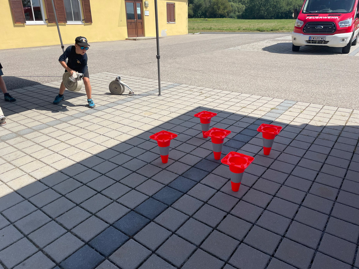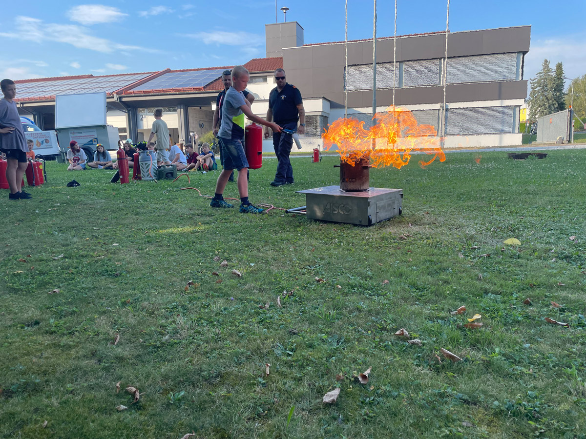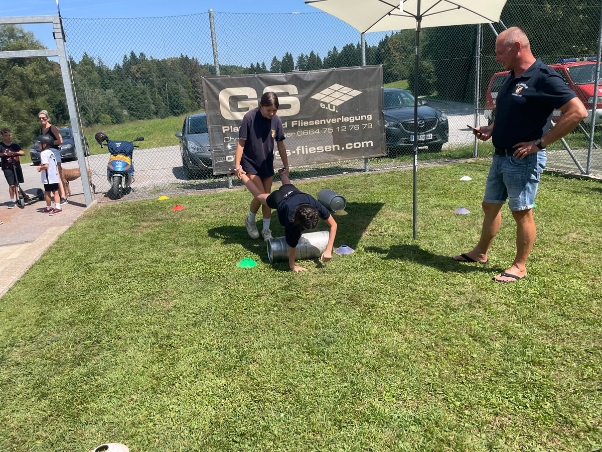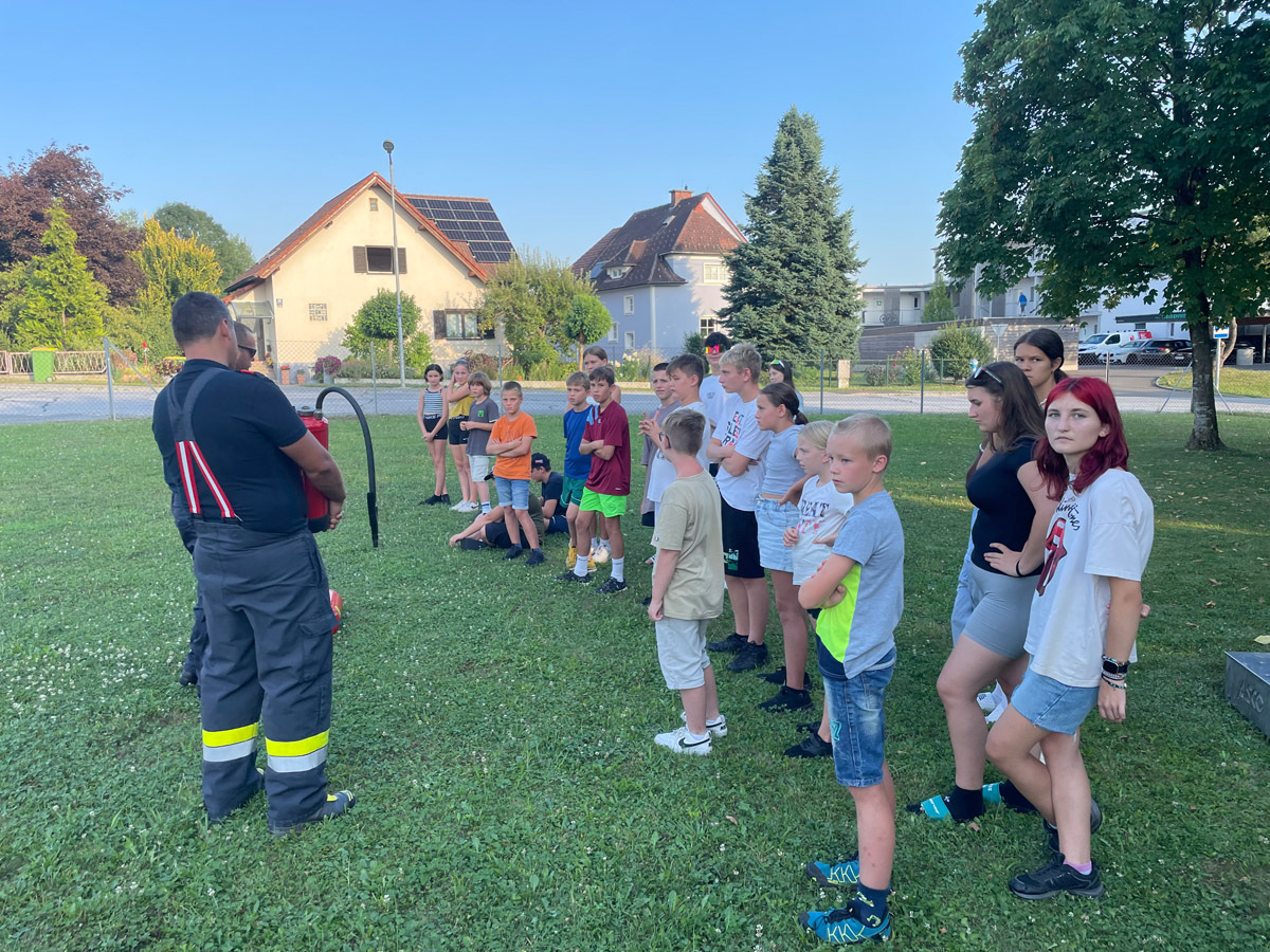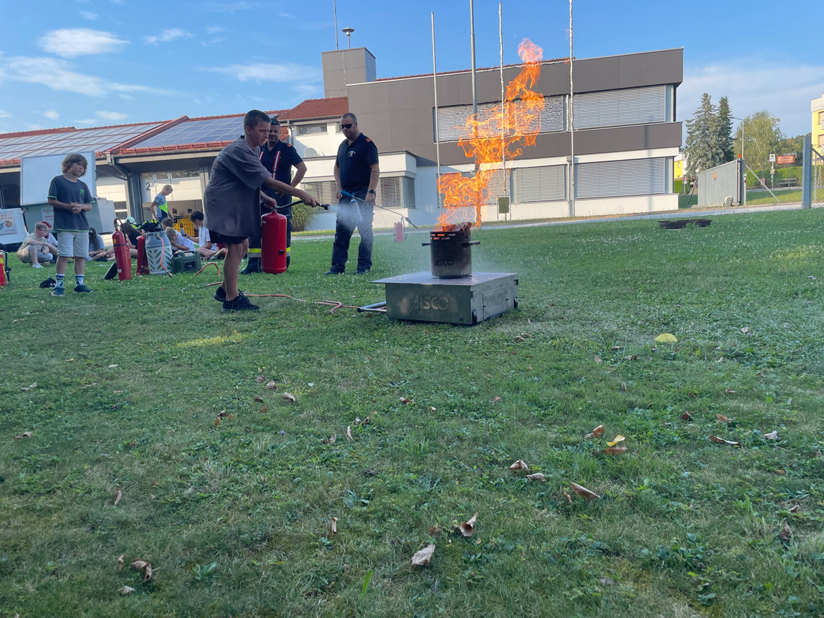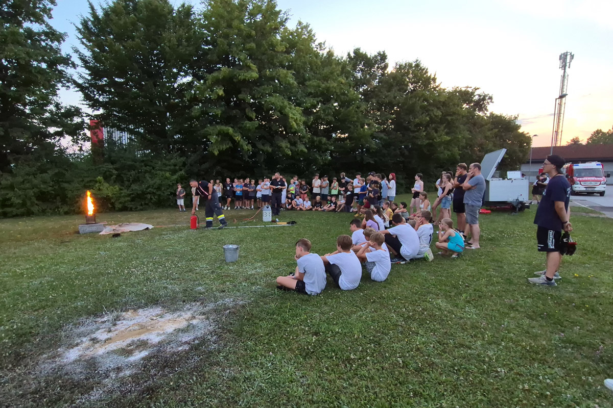 Auch sonst wurde das Rahmenprogramm interessant und spielerisch gestaltet. So durften die Mädels und Burschen im Zuge einer Vorstellung des Themas „Entstehungsbrandbekämpfung“ die richtige Handhabung verschiedener Feuerlöscher kennenlernen und selbst anwenden. Das Rote Kreuz Gleisdorf kam zu Besuch und gab einen Einblick in das Thema der Ersten Hilfe und der Zusammenarbeit zwischen Feuerwehr- und Rettungswesen. Weiters wurden auch die Drehleiter der Feuerwehr Gleisdorf und die Einsatzdrohne des BFV Weiz vorgestellt. Auch der Besuch vom Modellsportverein „Die Stoakraxler“ mit ihren ferngesteuerten Geländefahrzeugen war ein Highlight für unsere Feuerwehrjugend, sowie der gemeinsame Filme-Abend im Diesel Kino Gleisdorf.