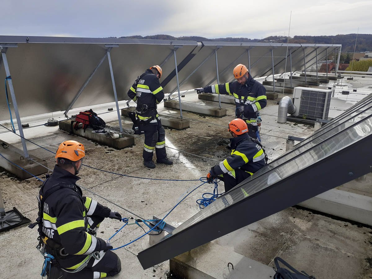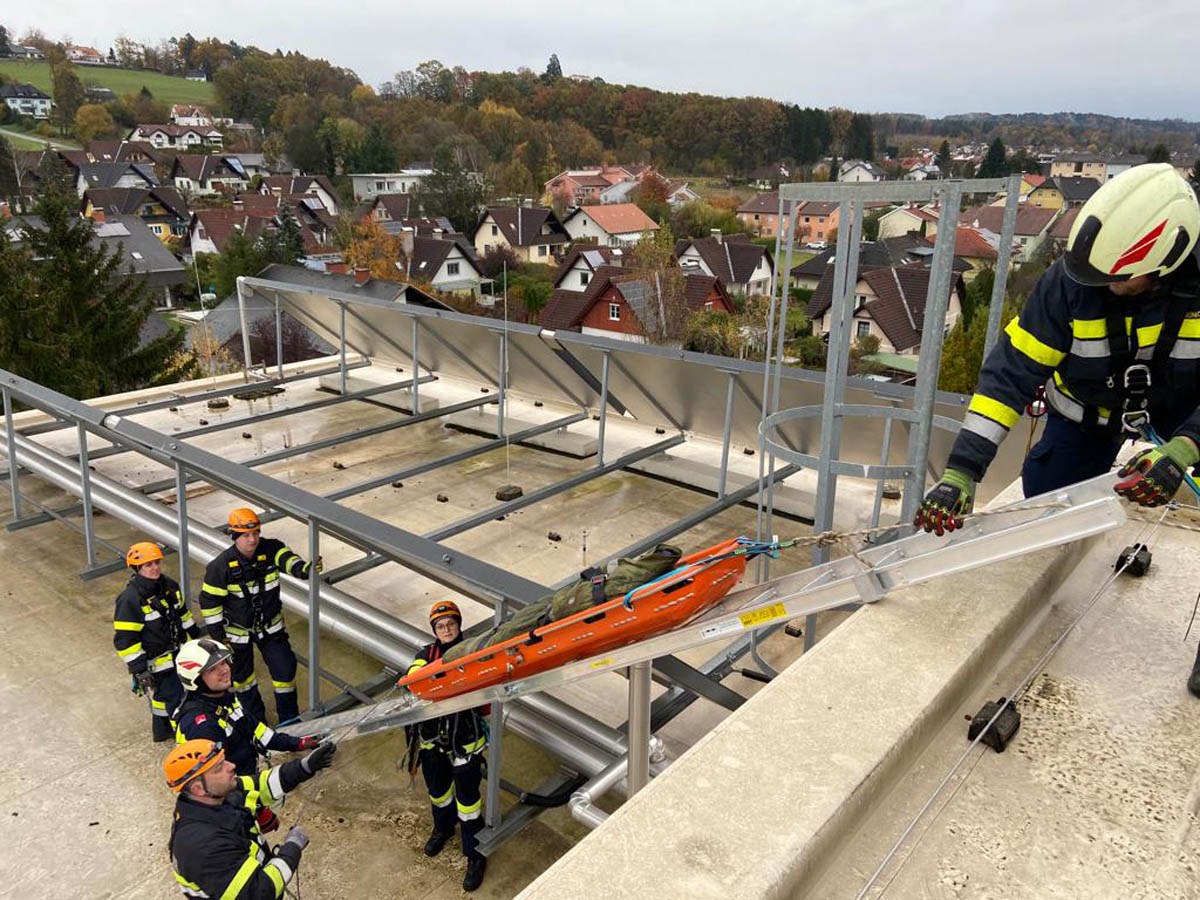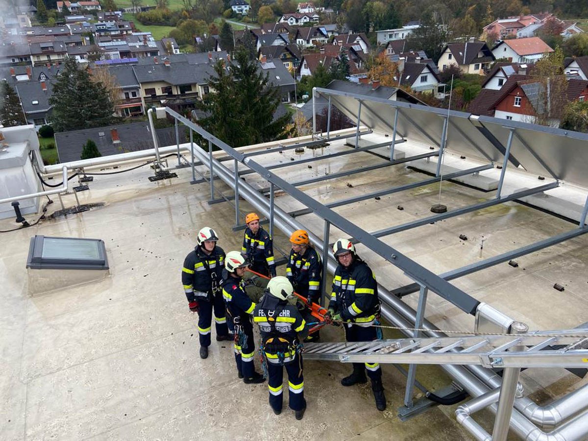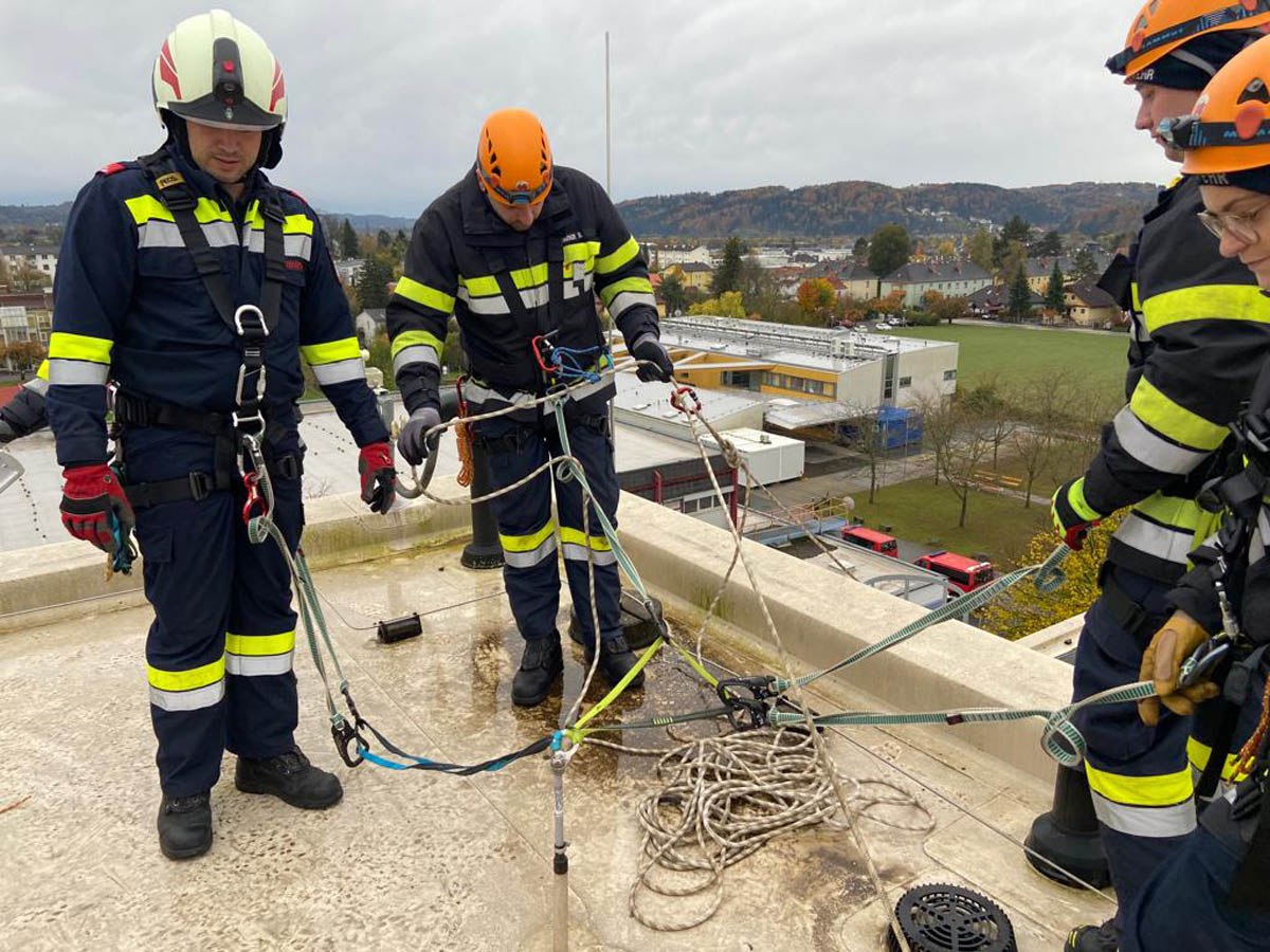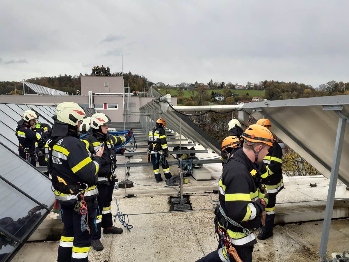 Das Dach der Mittelschule Gleisdorf diente am Samstag den 11.11.2023 als Weiterbildungslocation für die 35 Kamerad:Innen des Sachgebietes der Menschenrettung und Absturzsicherung (MRAS).