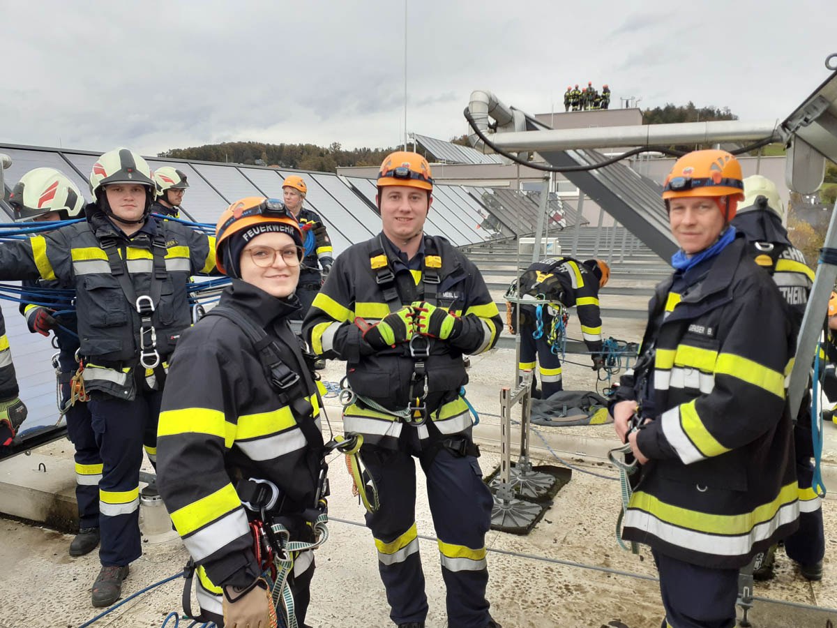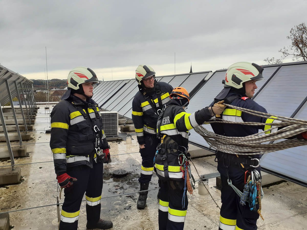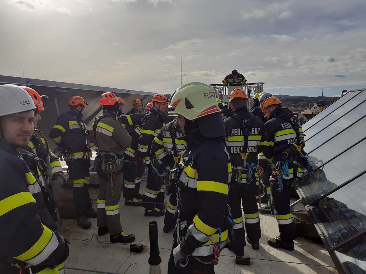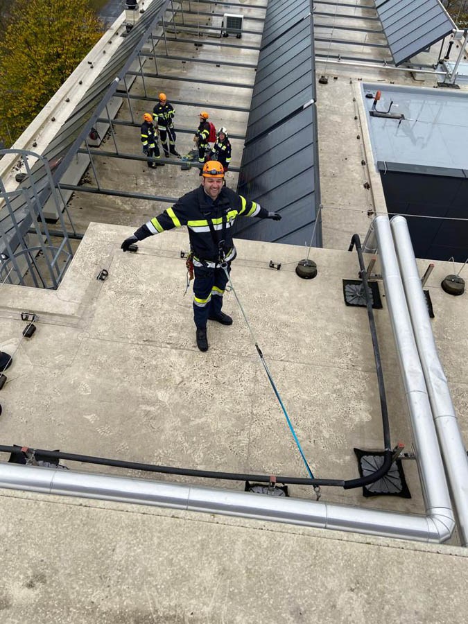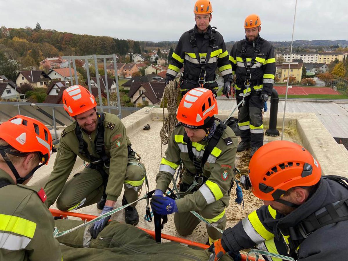 Das Dach der Mittelschule Gleisdorf diente am Samstag den 11.11.2023 als Weiterbildungslocation für die 35 Kamerad:Innen des Sachgebietes der Menschenrettung und Absturzsicherung (MRAS).