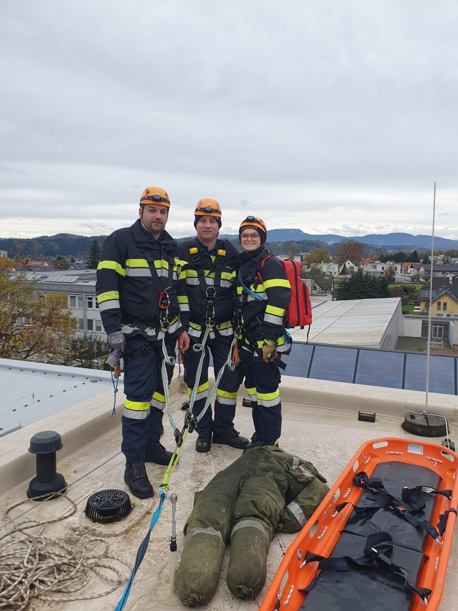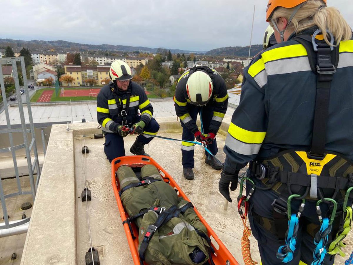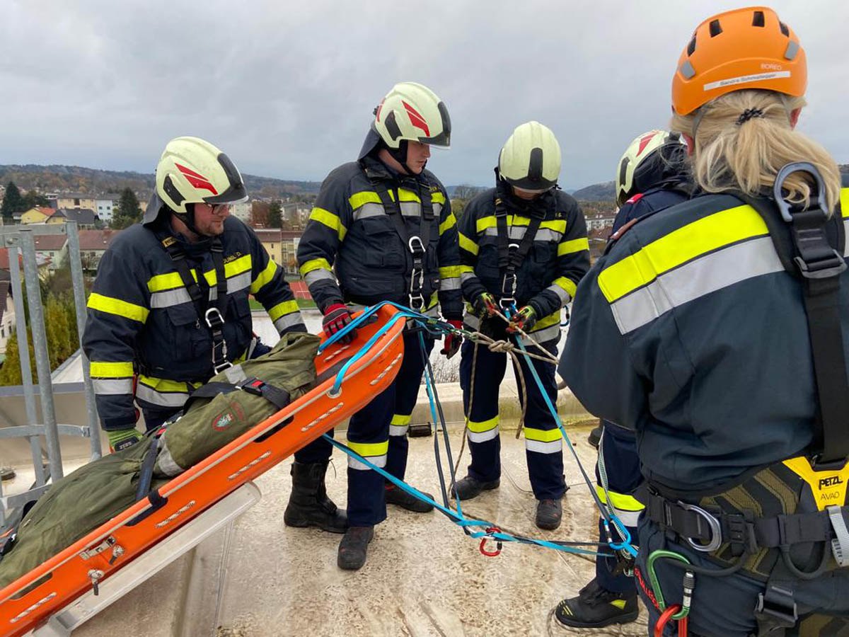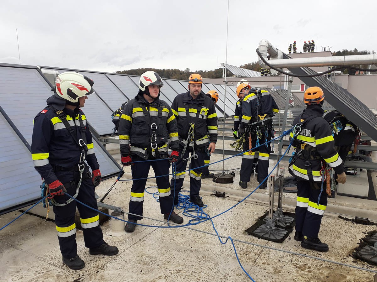 Das Dach der Mittelschule Gleisdorf diente am Samstag den 11.11.2023 als Weiterbildungslocation für die 35 Kamerad:Innen des Sachgebietes der Menschenrettung und Absturzsicherung (MRAS).