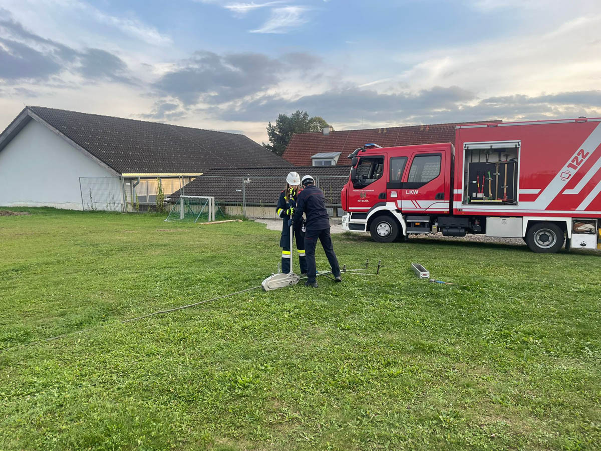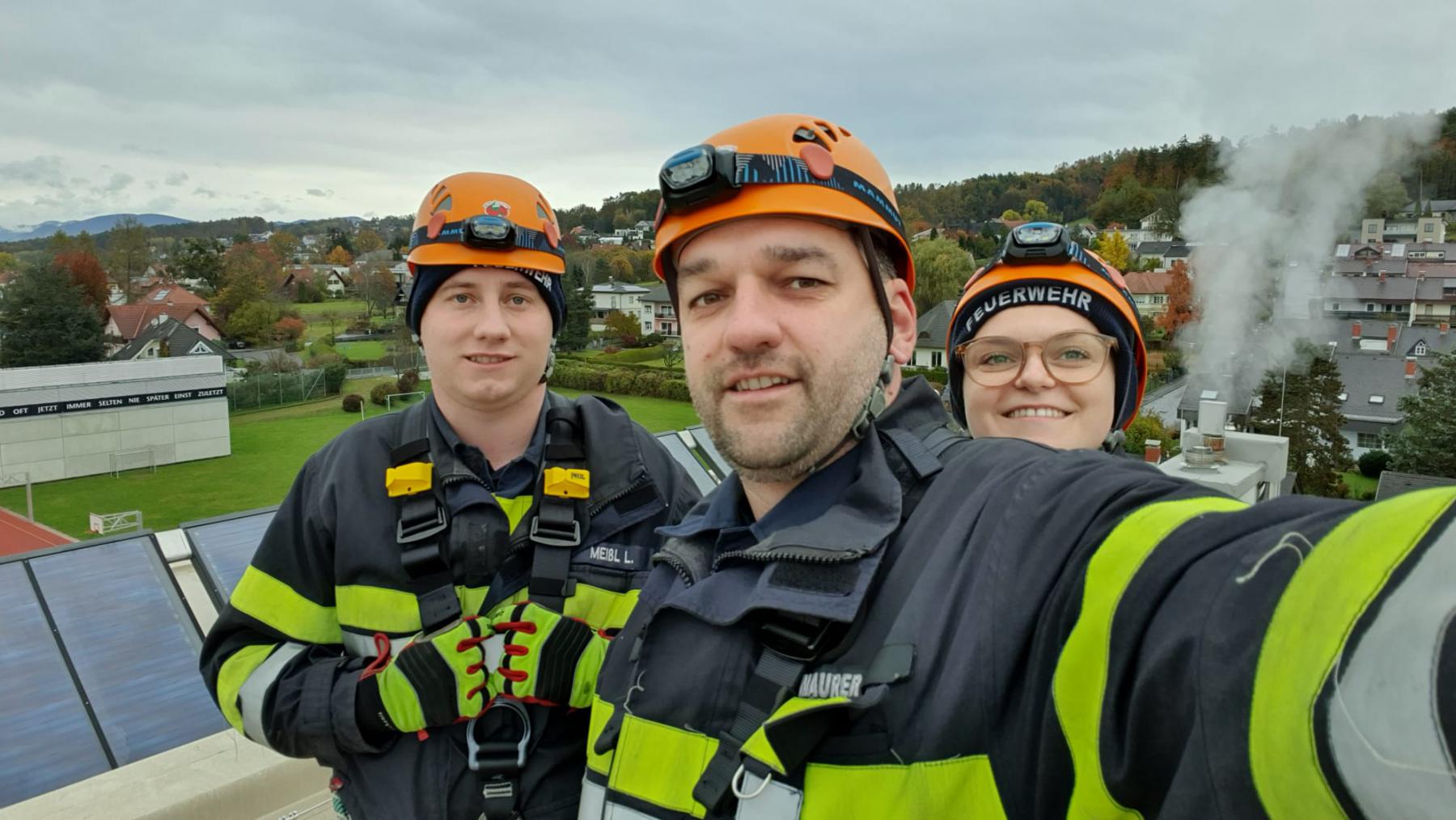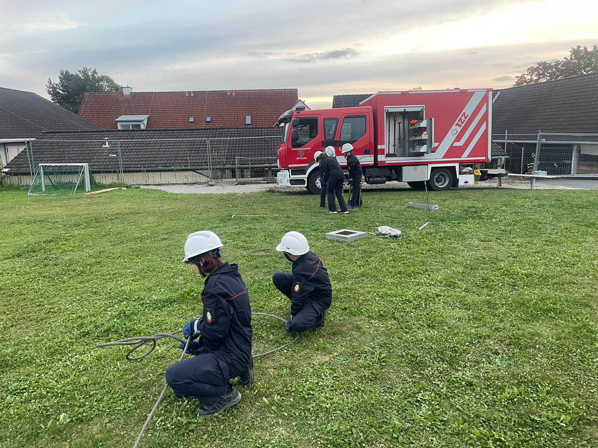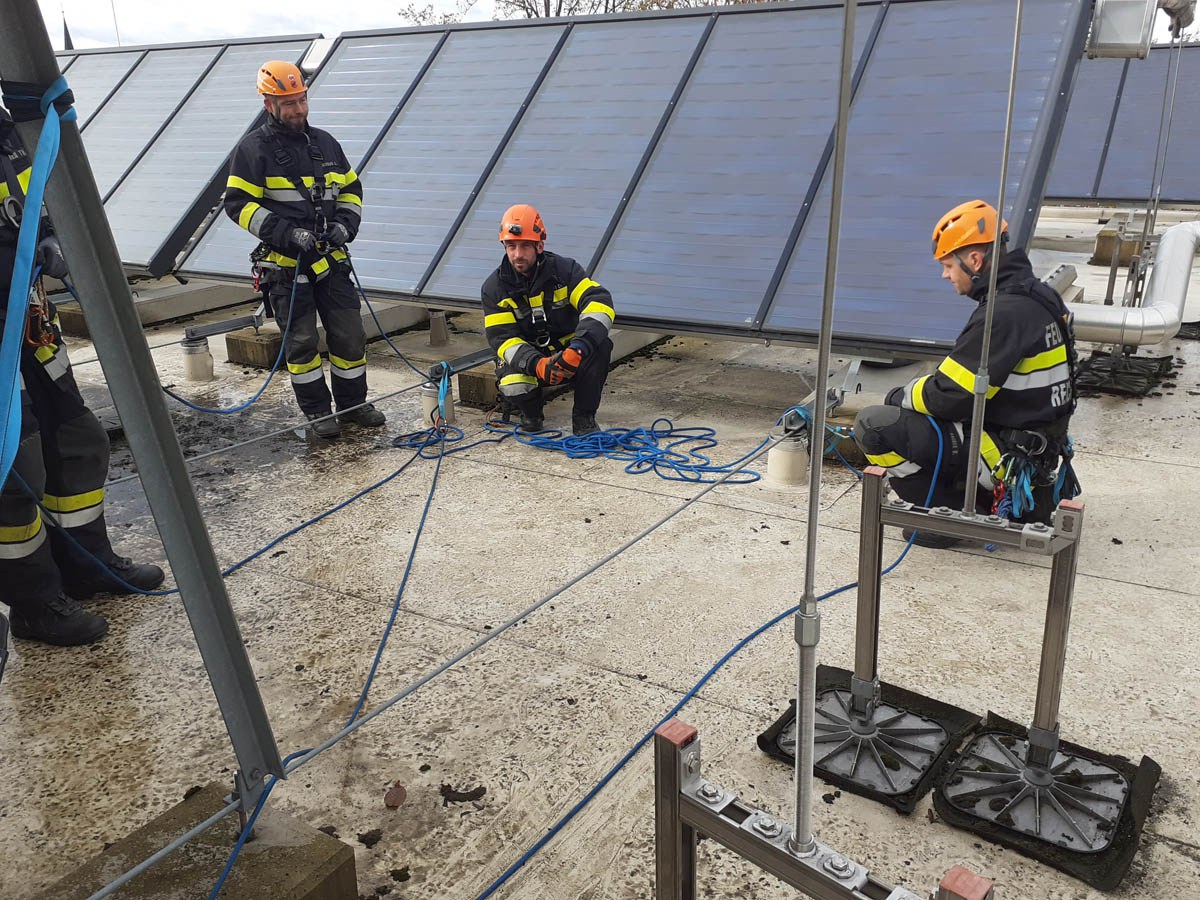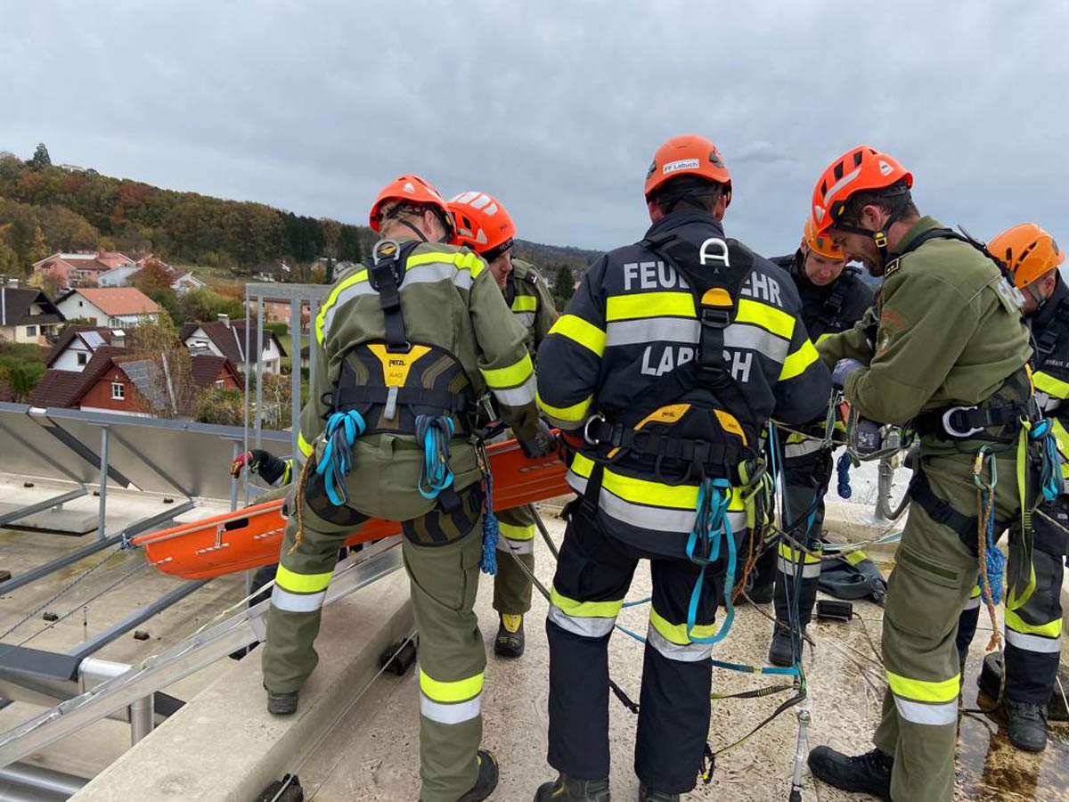 Das Dach der Mittelschule Gleisdorf diente am Samstag den 11.11.2023 als Weiterbildungslocation für die 35 Kamerad:Innen des Sachgebietes der Menschenrettung und Absturzsicherung (MRAS).