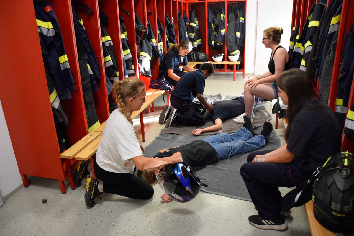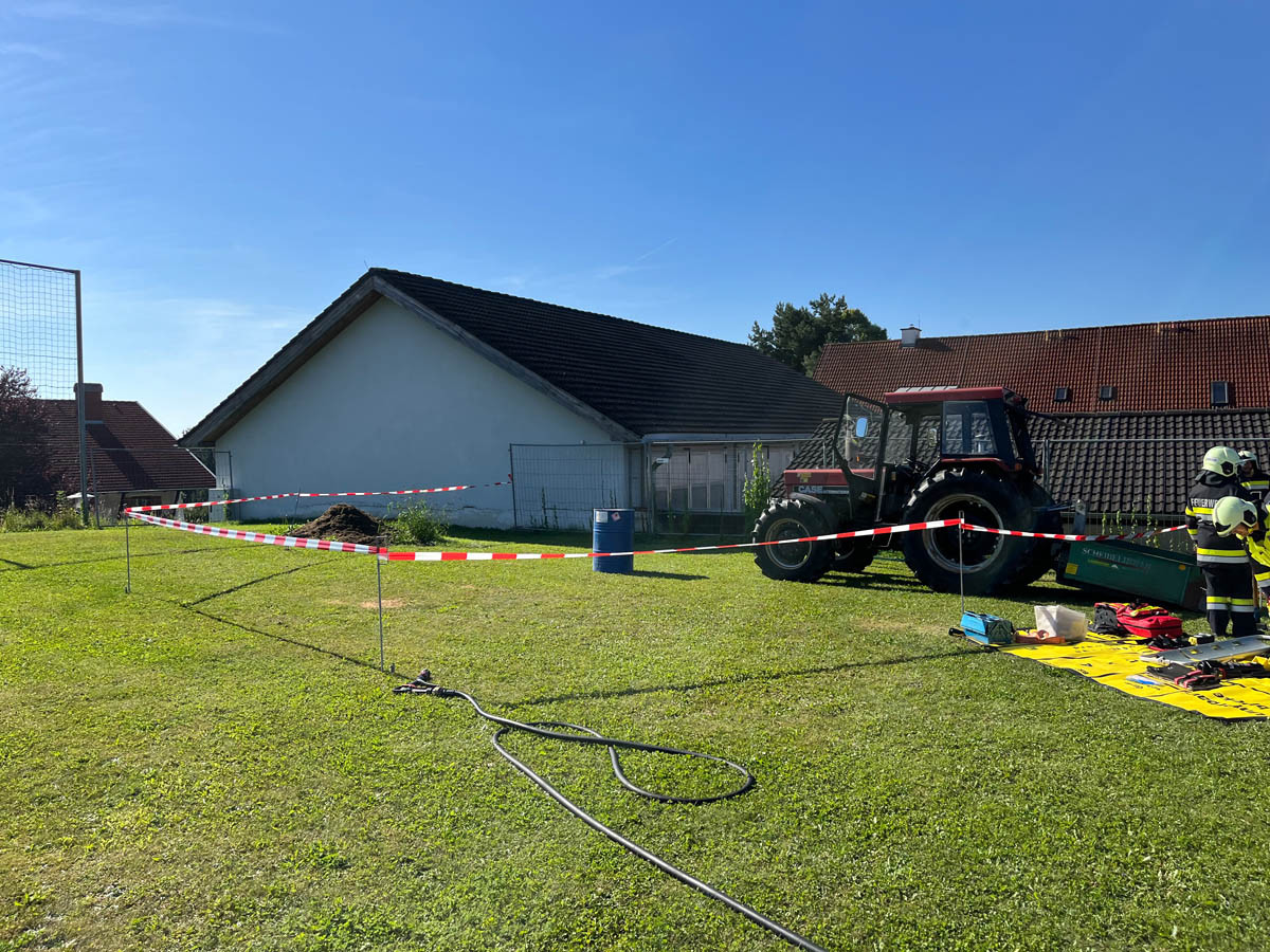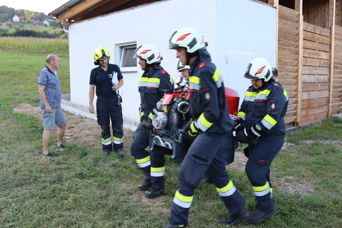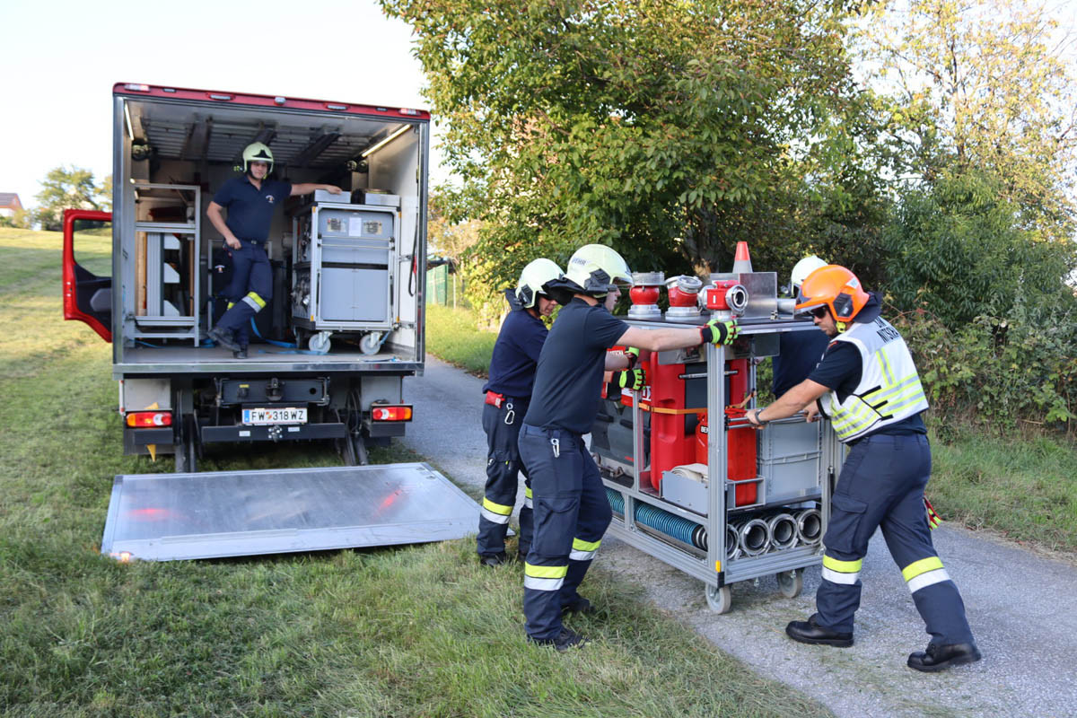 Währenddessen wurde die Löschwasserversorgungunter anderem mittels Tragkraftspritzen aus der vorbeifließenden Raab sichergestellt, und die Brandbekämpfung an mehreren Einsatzabschnitten durchgeführt. Auch die FF Weiz wurde mit ihrem ASF (Atemschutzfahrzeug) zur Übung hinzugezogen, um die verwendeten Atemschutzflaschen vor Ort wieder füllen zu können. Weiters wurde das angrenzende Gefahrengutlager aus Sicherheitsgründen geräumt. Dabei kam es zu einem Gefahrgutunfall, bei welchem ein IBC-Container beschädigt wurde. Durch das auslaufende Medium wurde eine Person bewusstlos und kam anschließend zum erliegen. Da es sich in der Erstphase um einen unbekannten Stoff handelte, wurde die Absperrgrenze erweitert und ein 3-facher Brandschutz aufgebaut. Ein Atemschutztrupp rüstete sich mit der Schutzstufe 1 aus und begann mit der Menschenrettung, der Ausbreitungsverhinderung sowie der inneren Erkundung. Das auslaufende Produkt wurde aufgefangen, der defekte Tank provisorisch abgedichtet und mittels Gefahrgutpumpe in einen Reservetank umgepumpt.