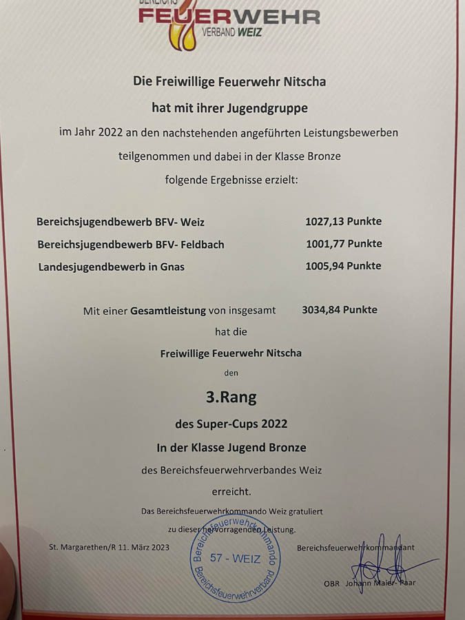 Weiters konnte unsere Jugendbewerbsgruppe im Bewerbsjahr 2022 beim Super-Cup in der Klasse Bronze den 3. Rang im Bereichsfeuerwehrverband Weiz erreichen. Dafür bekamen unsere Jugendlichen und Betreuer eine bronzene Medaille verliehen.