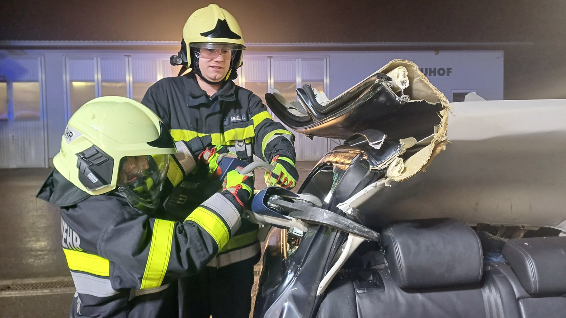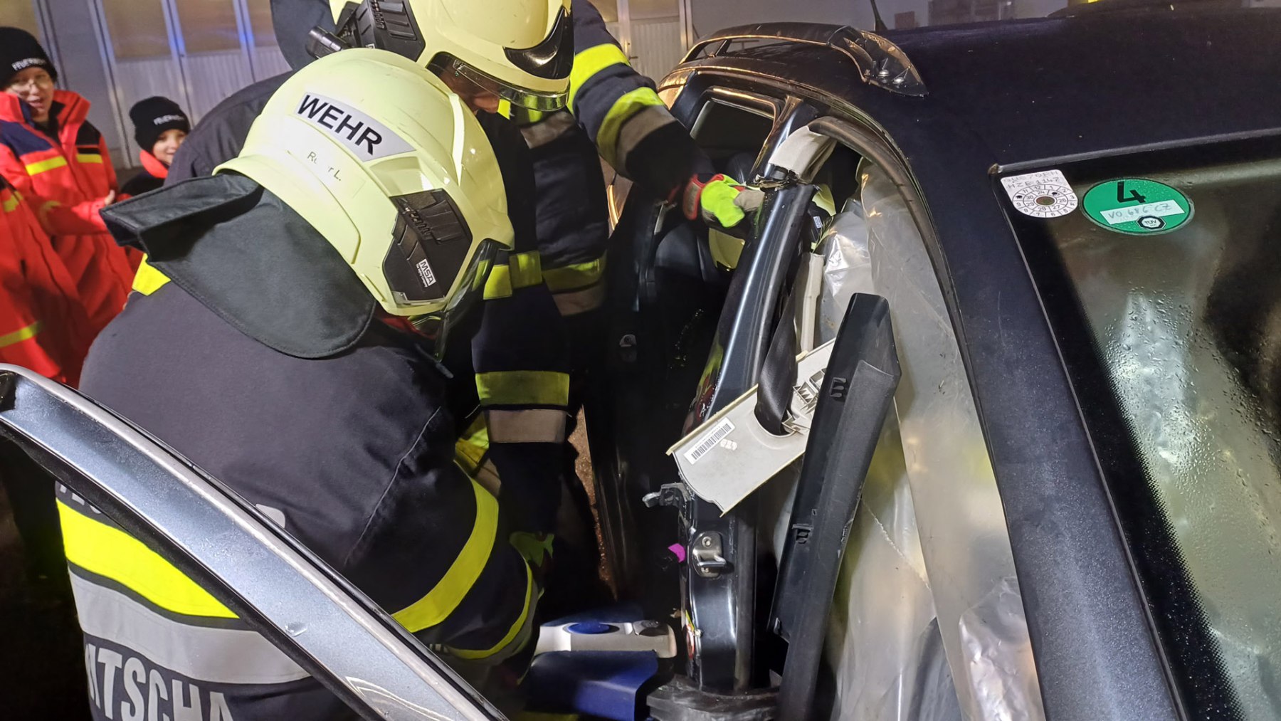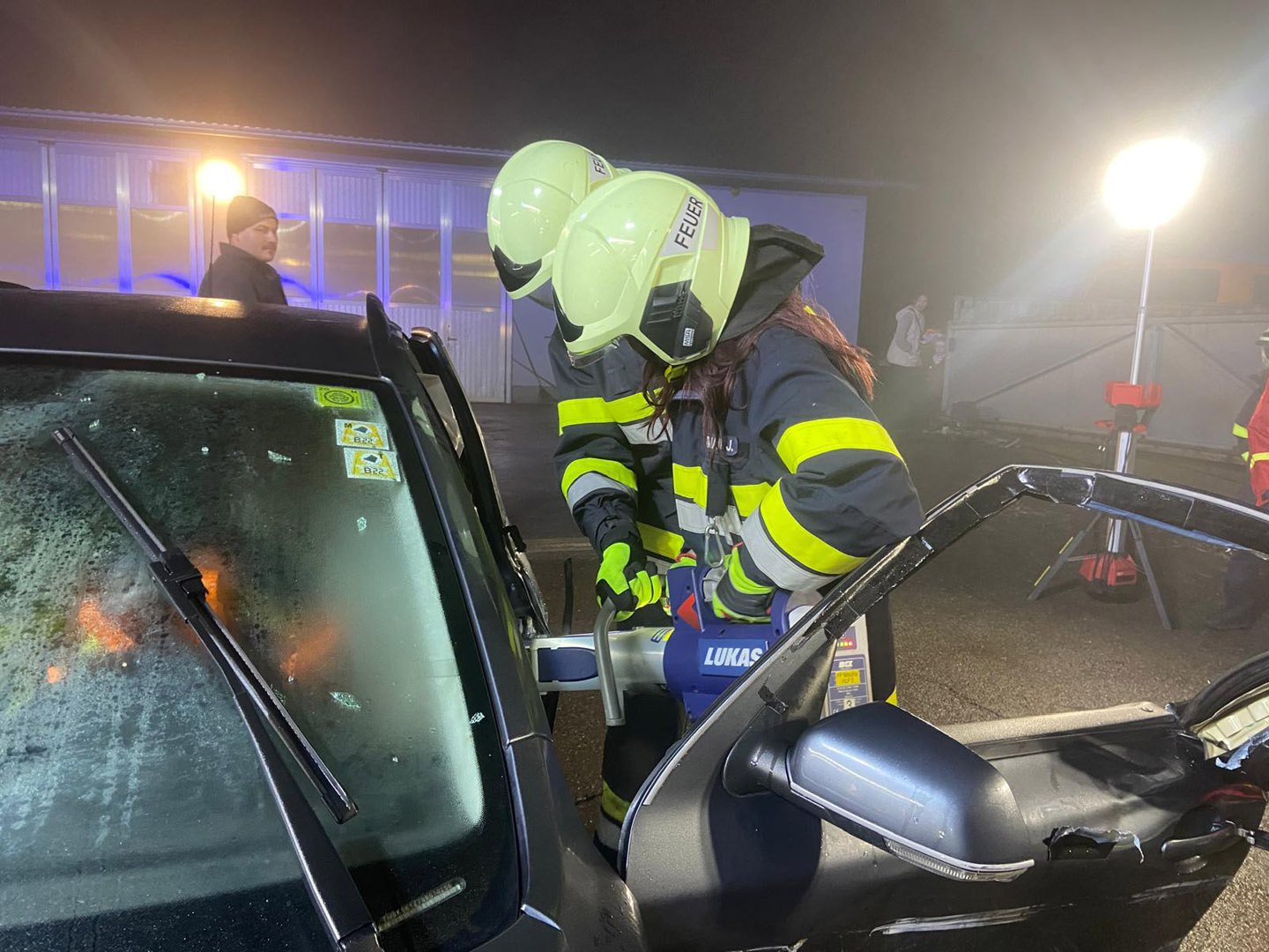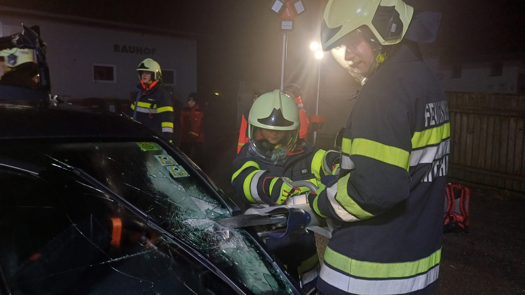Ein Verkehrsunfall mit eingeklemmter Person wurde bei einer weiteren Station simuliert. Dabei erklärte LM d. F. Dominik Neuhold die taktischen Hintergründe einer Menschenrettung sowie die Aufgaben des inneren Retters.