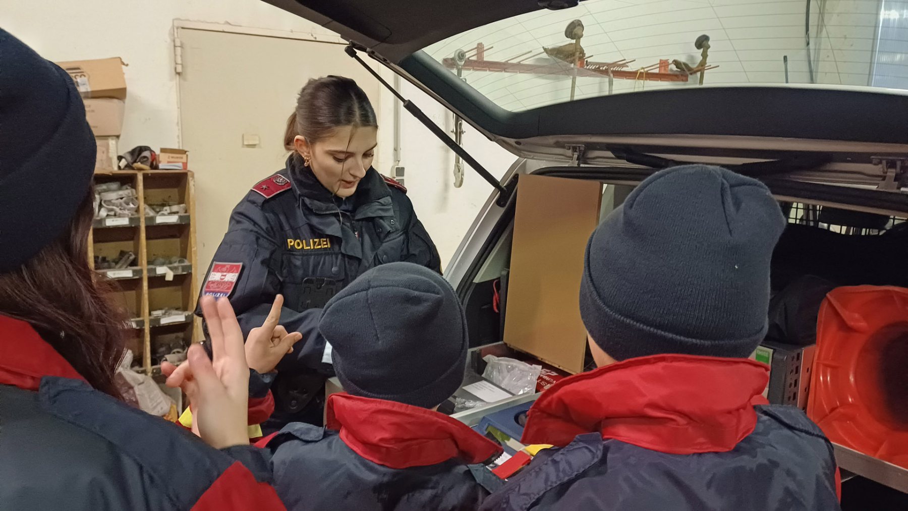 Bei einer weiteren Station brachte die Polizei den Jugendlichen das Polizeiauto und die dazugehörige Ausrüstung näher.