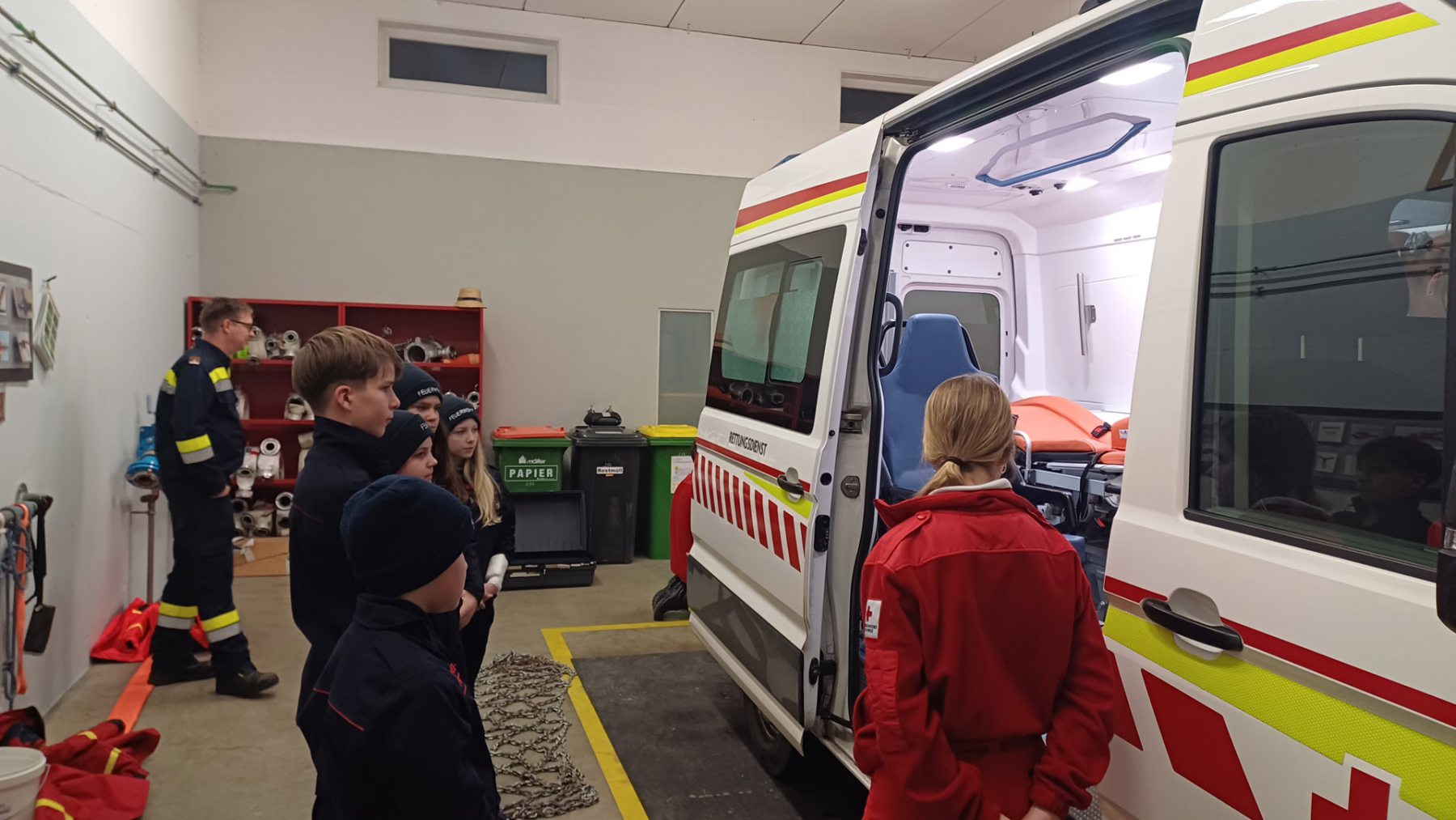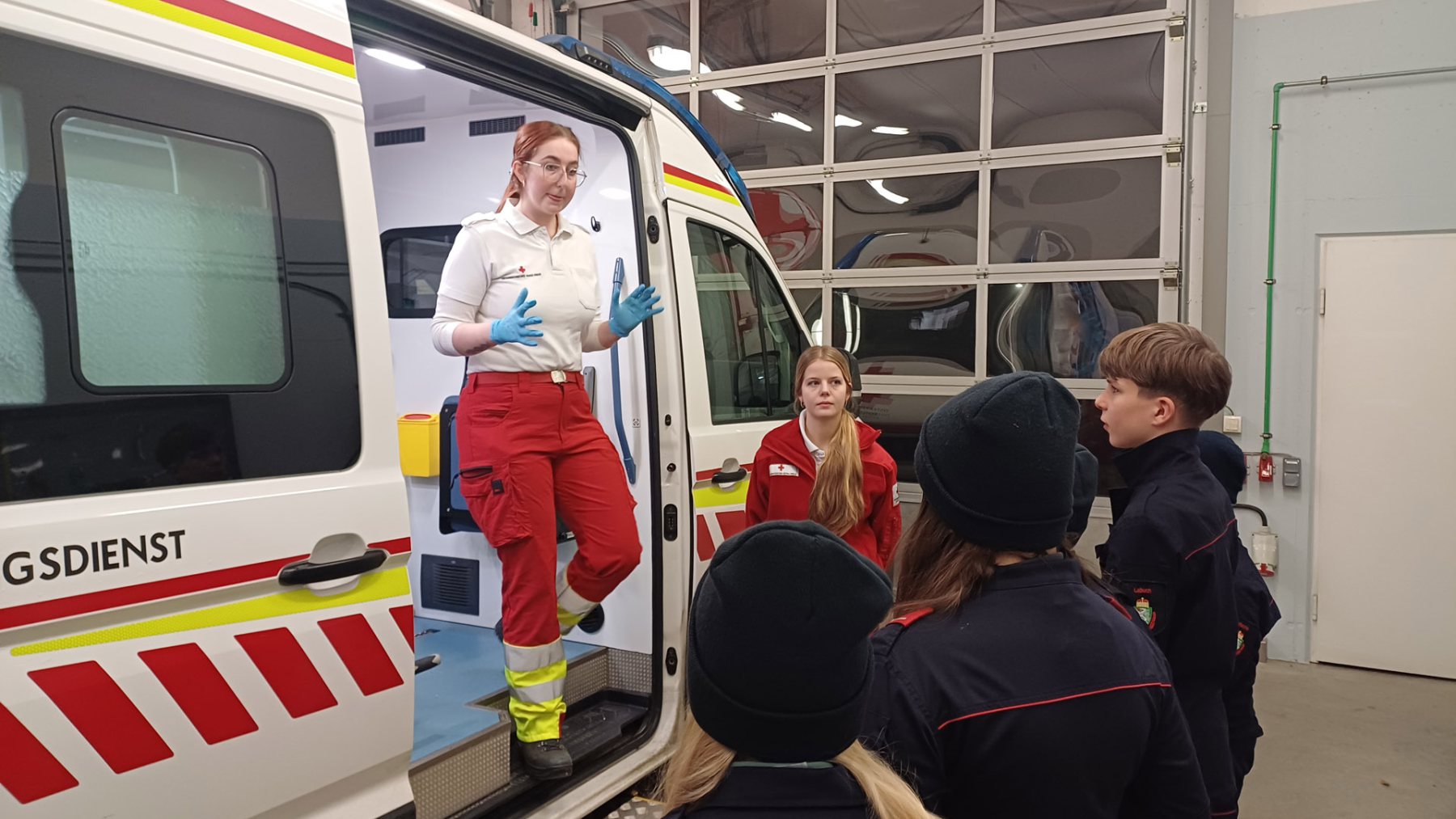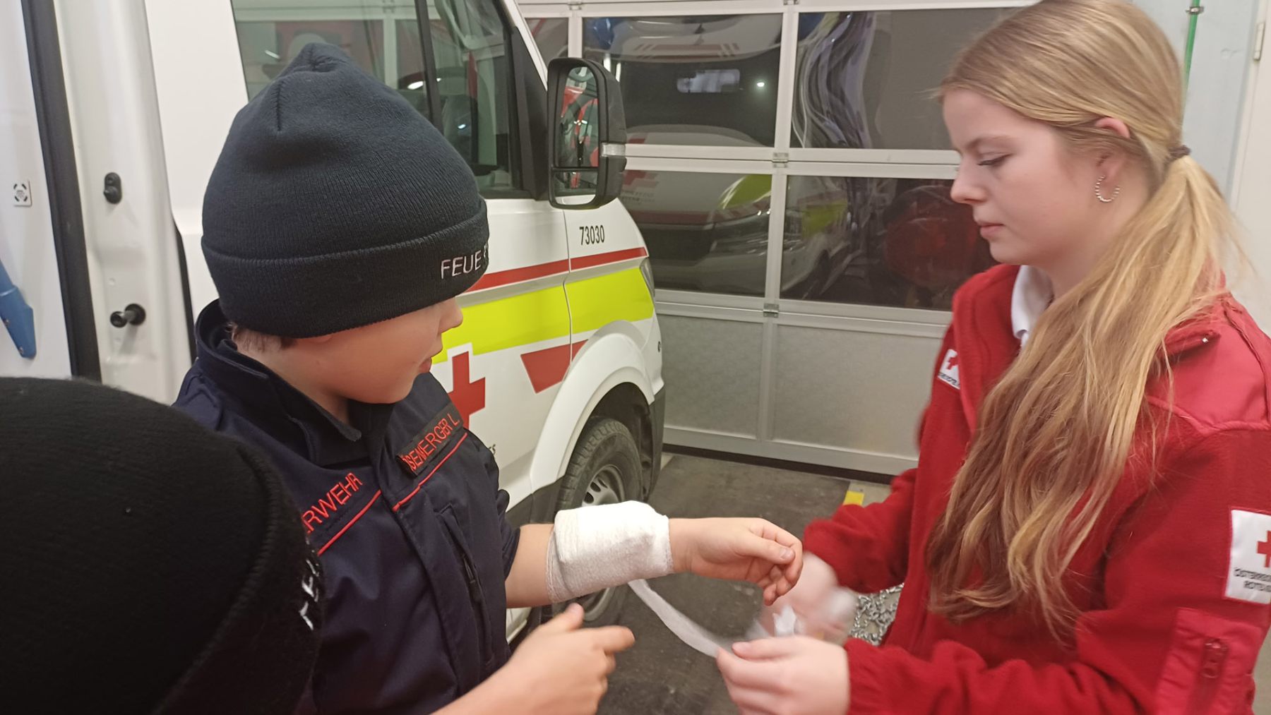 Bei der Station des Roten Kreuzes wurde den Jugendlichen der Rettungswagen sowie das dazugehörige Equipment vorgestellt. Natürlich durften sie auch selbst beim Versorgen einer verletzten Person mit anpacken.