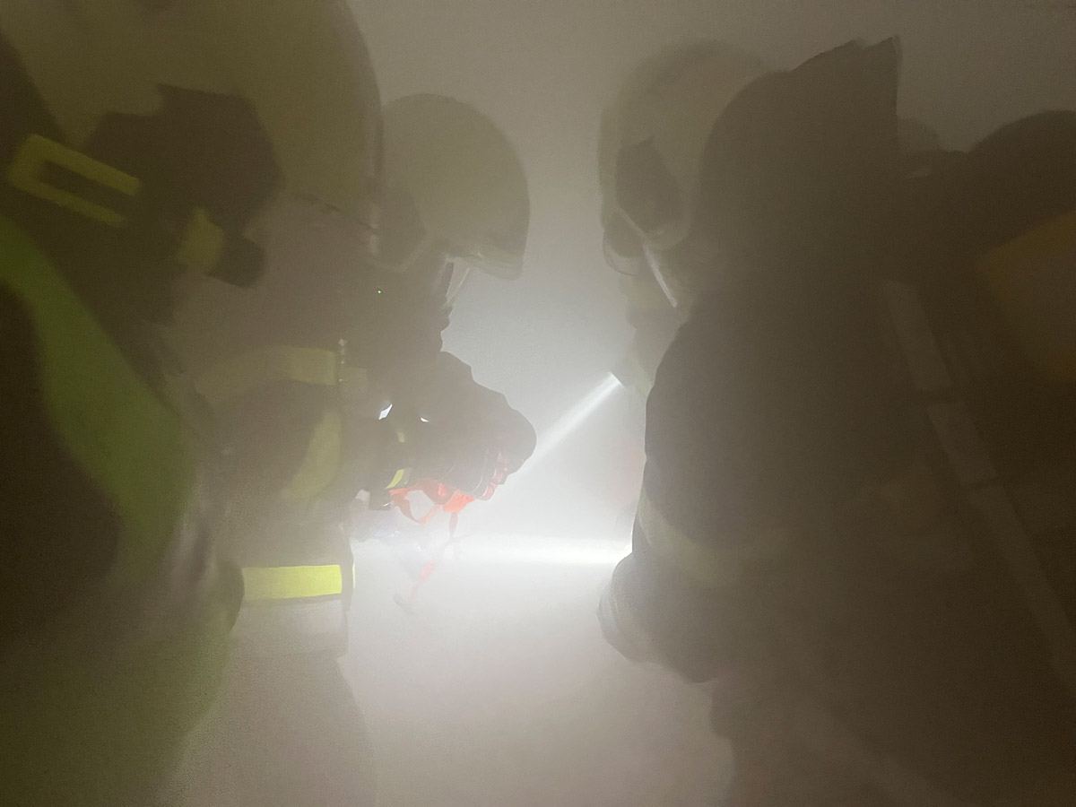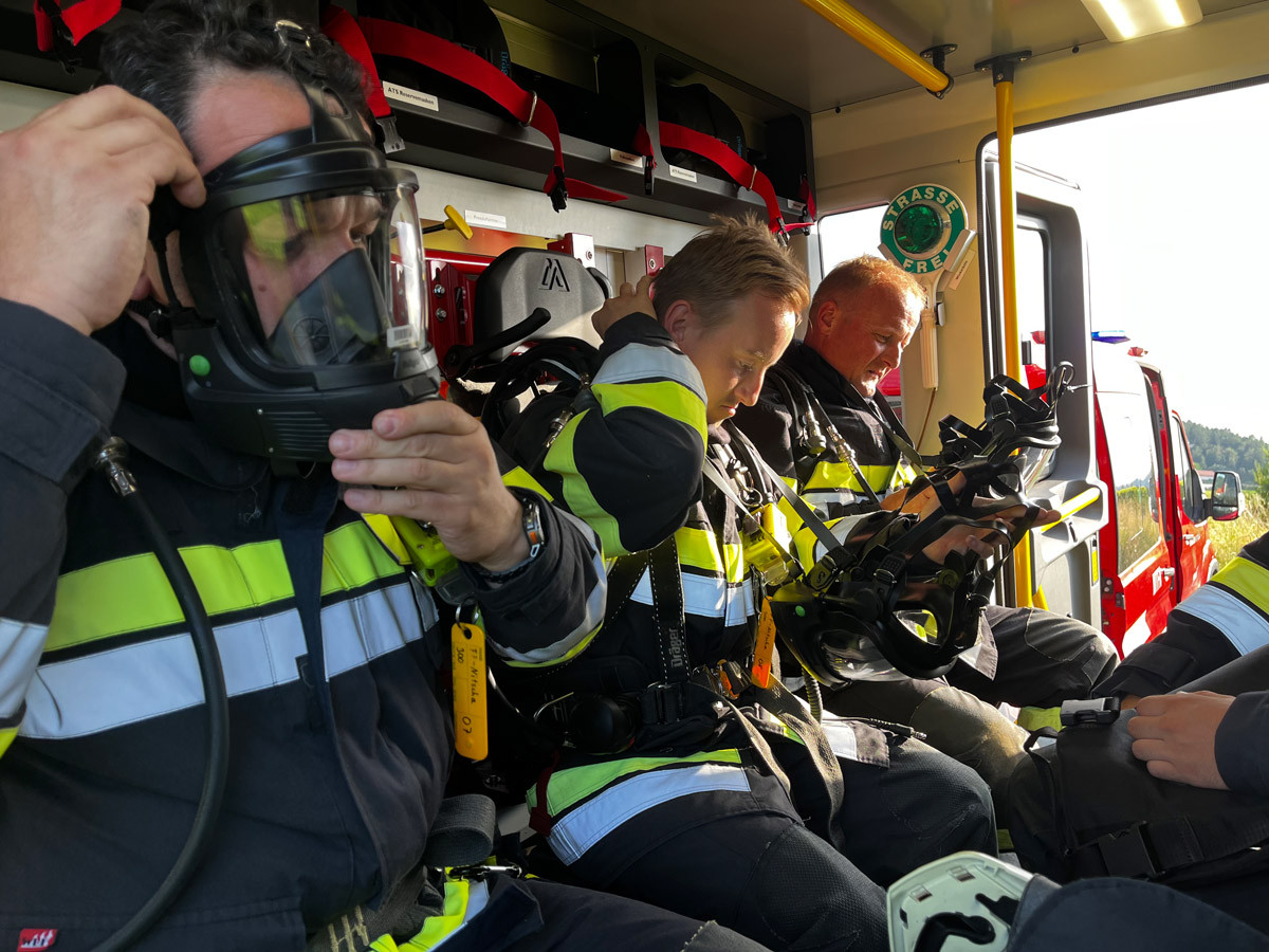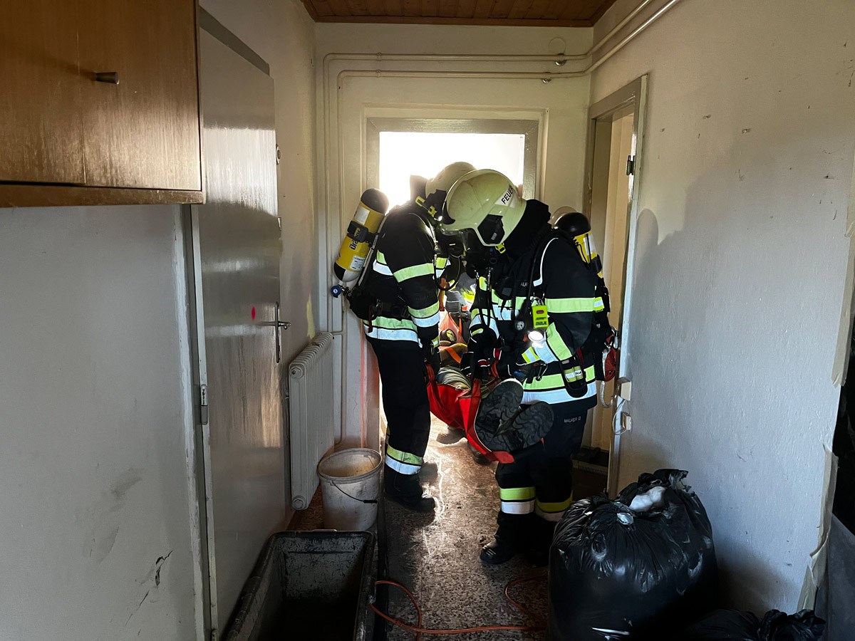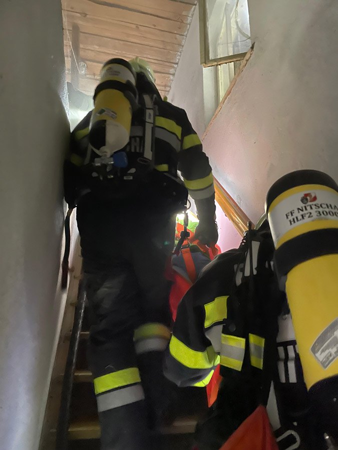 Unser Atemschutztrupp durchsuchte unter Einsatz der Wärmebildkamera und im Seitenkriechgang das gesamte Gebäude. Eine Person wurde im Erdgeschoss aufgefunden und mithilfe eines Tragetuchs und einer Brandfluchthaube gerettet. Die zweite Person befand sich im Keller und wurde mittels Chrashrettung in Sicherheit gebracht.