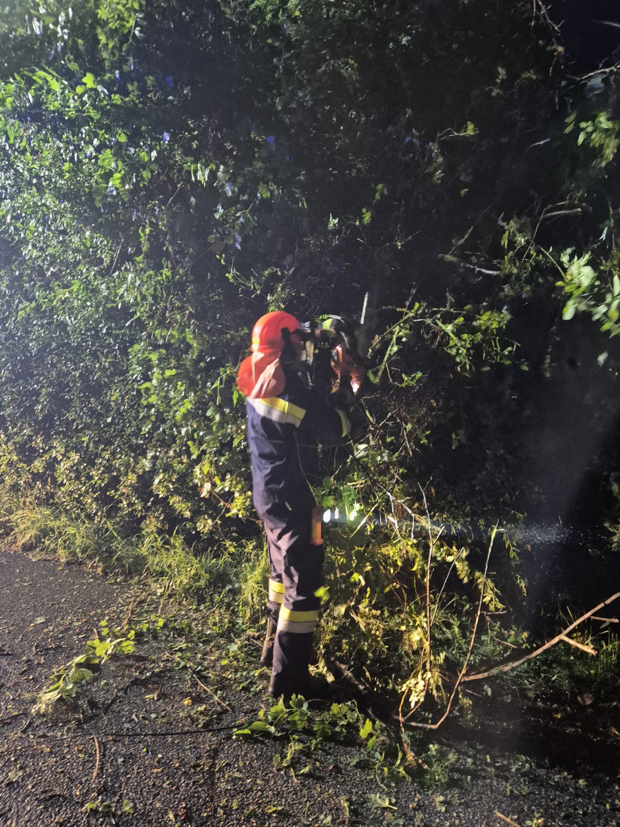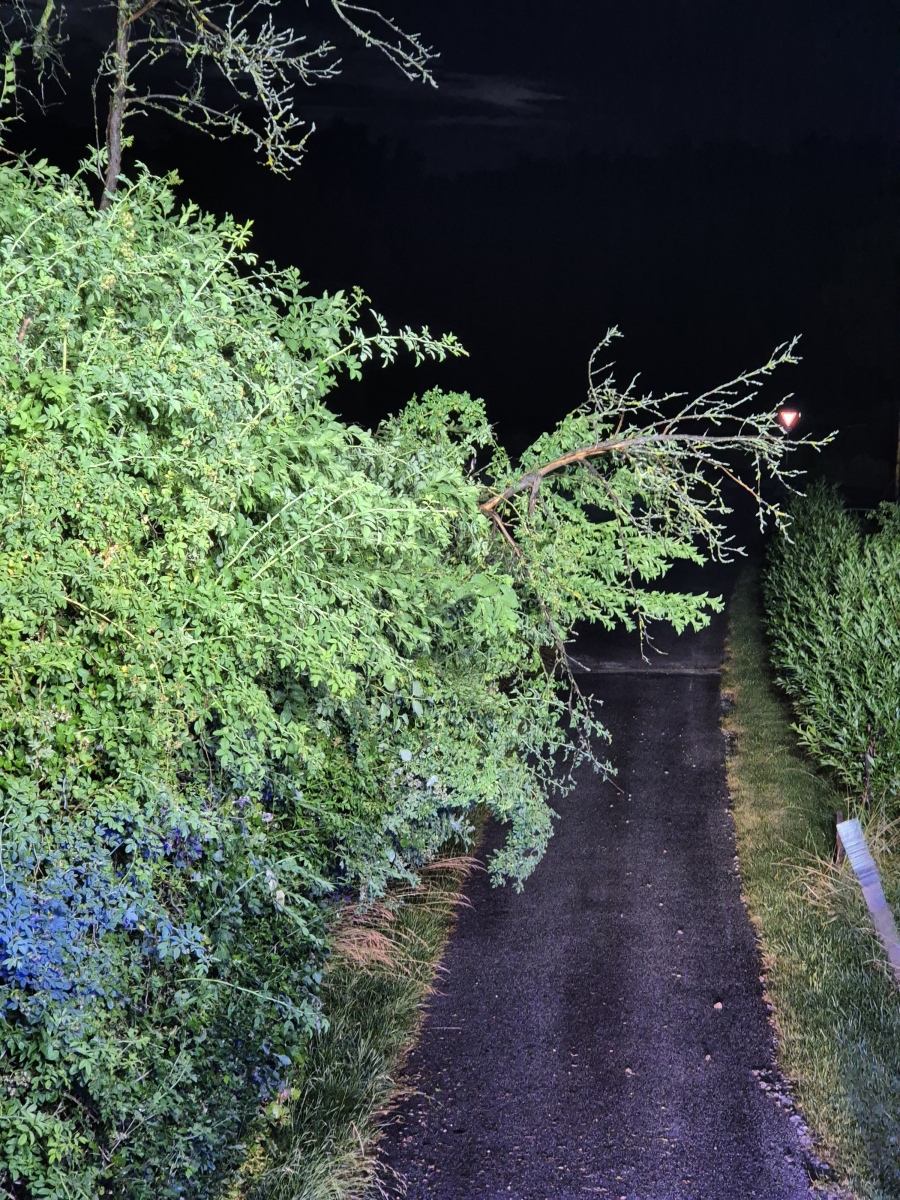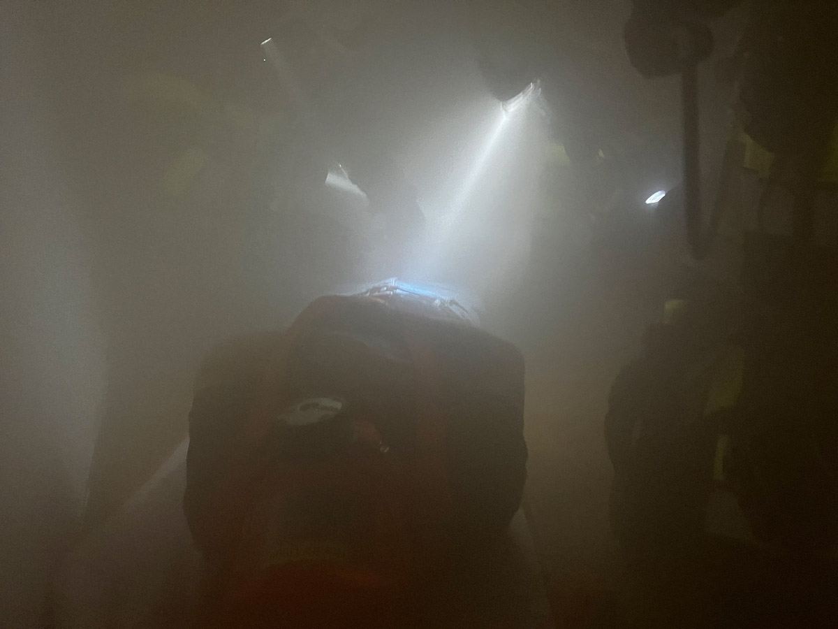 Unser Atemschutztrupp durchsuchte unter Einsatz der Wärmebildkamera und im Seitenkriechgang das gesamte Gebäude. Eine Person wurde im Erdgeschoss aufgefunden und mithilfe eines Tragetuchs und einer Brandfluchthaube gerettet. Die zweite Person befand sich im Keller und wurde mittels Chrashrettung in Sicherheit gebracht.