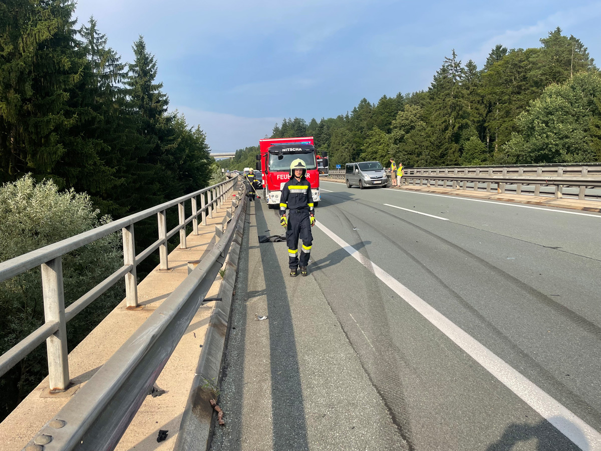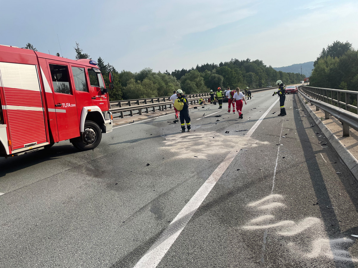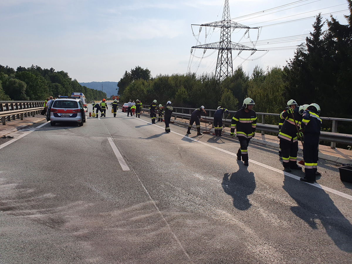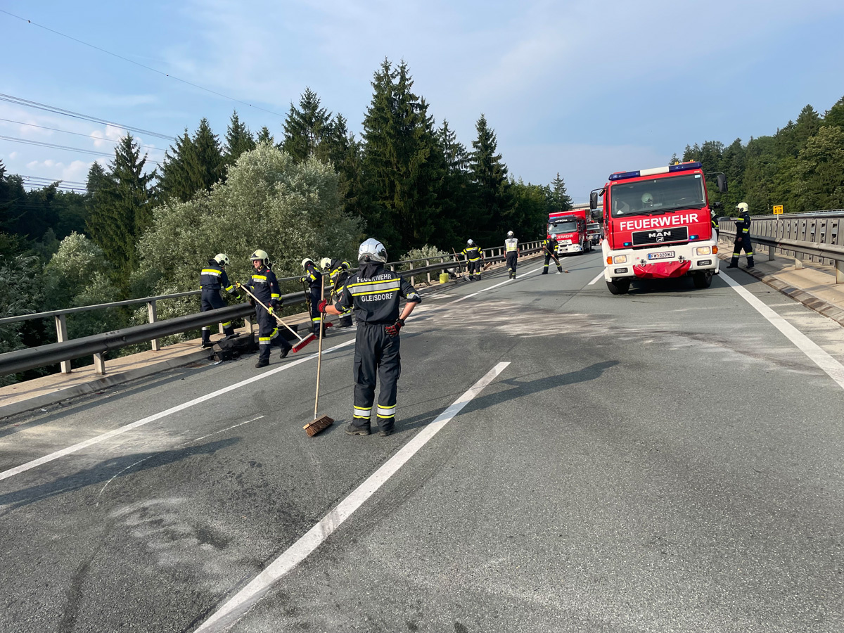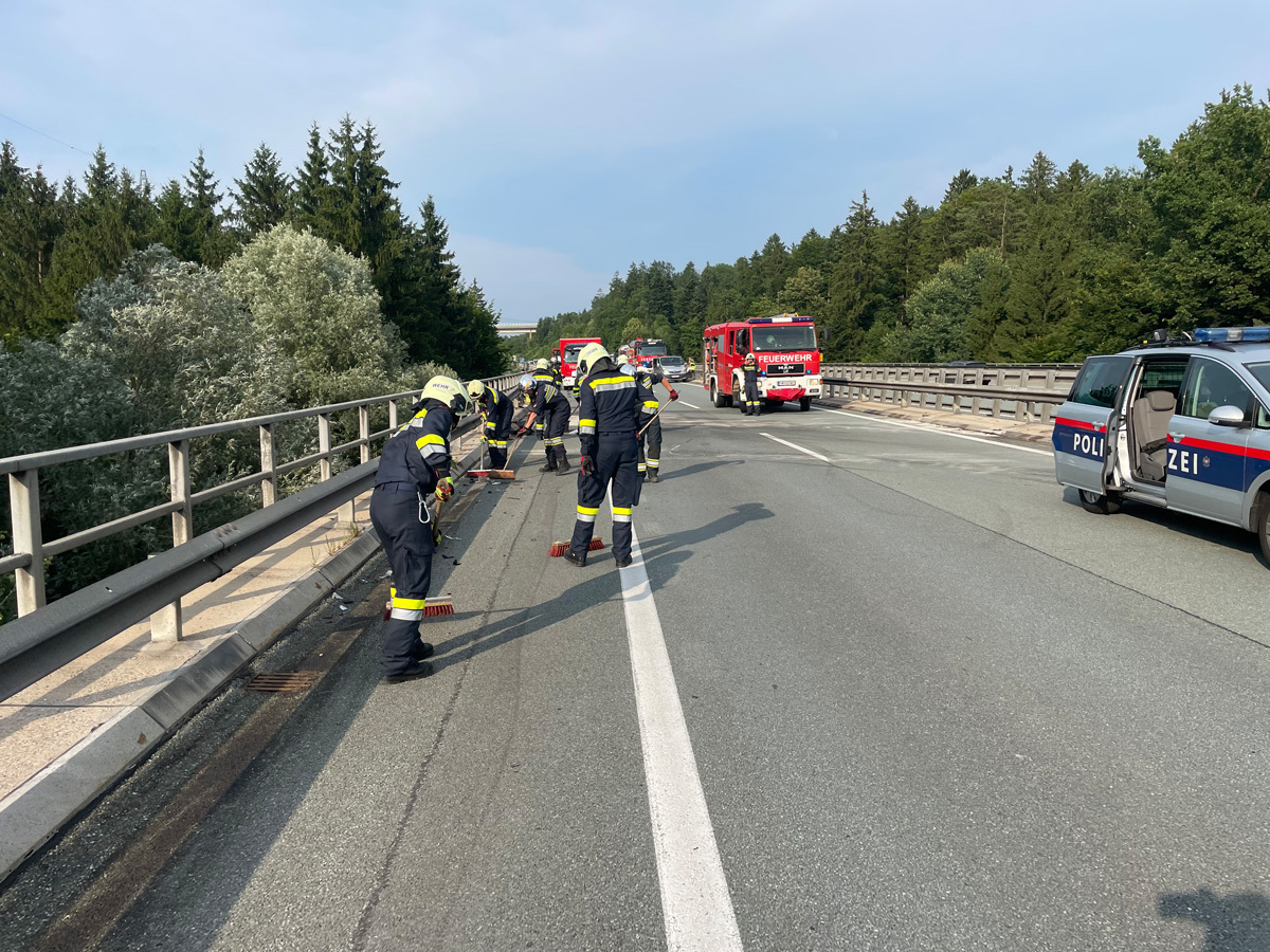 Einsatzkräfte: TLF-A 2000 und LKW Nitscha mit 16 Mann, FF Gleisdorf, Rettung, Polizei, ASFINAG, Abschleppunternehmen