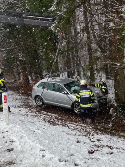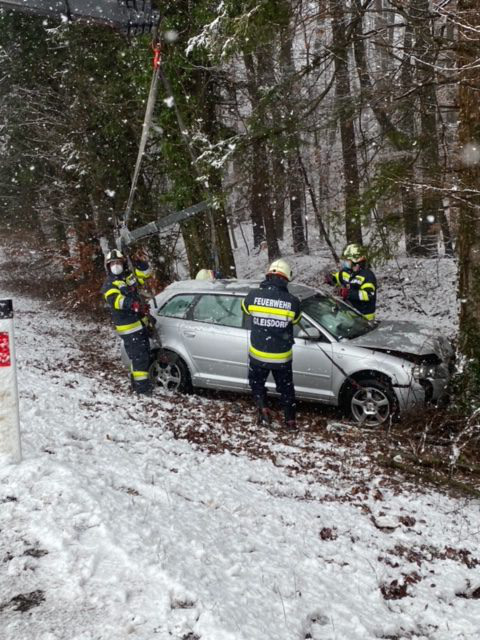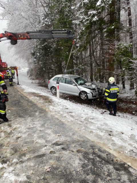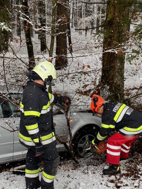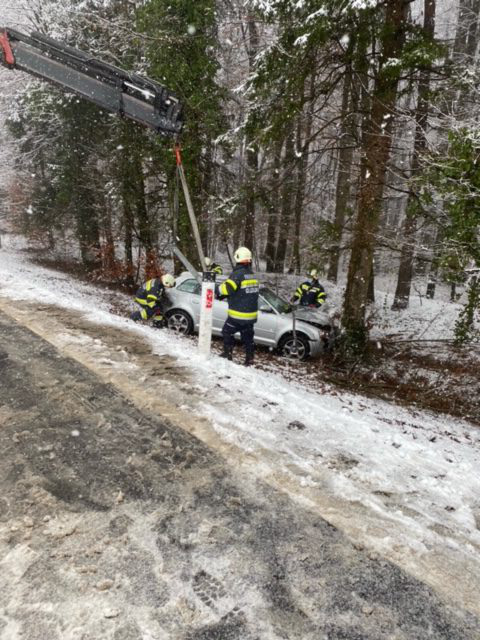 Tätigkeit: Unfallstelle absichern, Brandschutz aufbauen, Verletzte Person mit Rettung betreuen, PKW mittels Seilwinde bergen, Unfallstelle reinigen