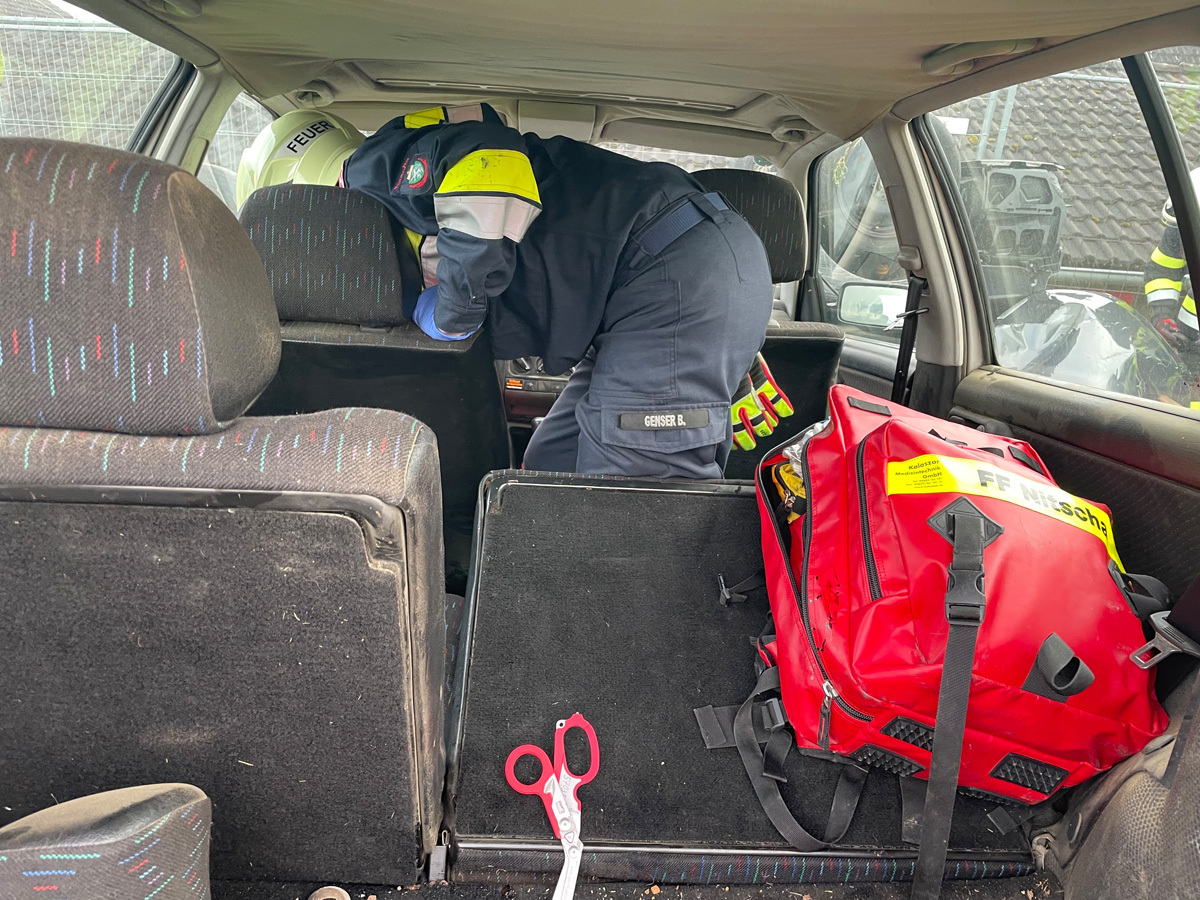 Tätigkeit: Unfallstelle absichern, Brandschutz aufbauen, Retten der beiden verletzten Personen mittels hydraulischem Rettungsgerät und Schaufeltrage; Löschen eines Entstehungsbrand im Unfallbereich mittels Pulverlöscher