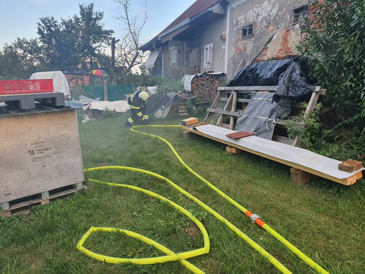 Tätigkeit: Absichern; Eine Person mit schwerem Atemschutz aus Keller retten; Eine weitere Person war unter einem Traktor eingeklemmt, diese wurde mittels Hebekissen befreit; Herstellung einer Zubringleitung