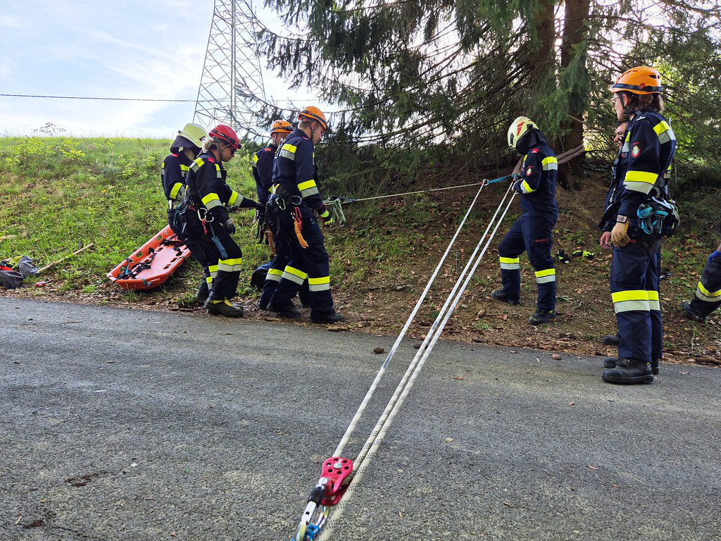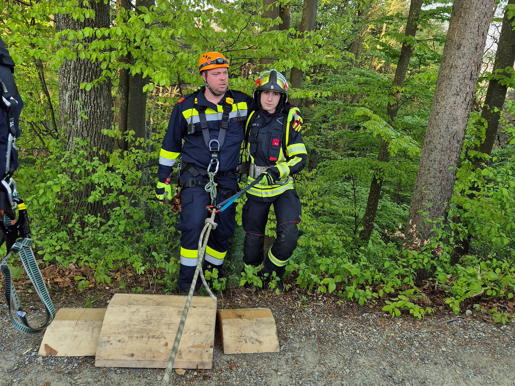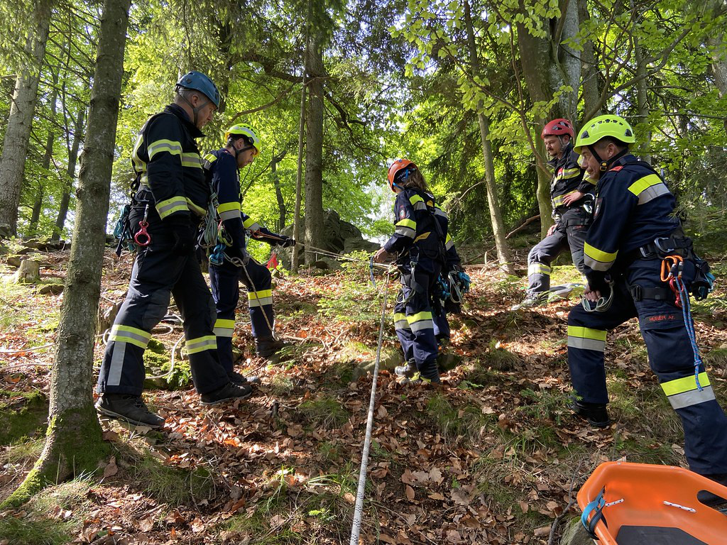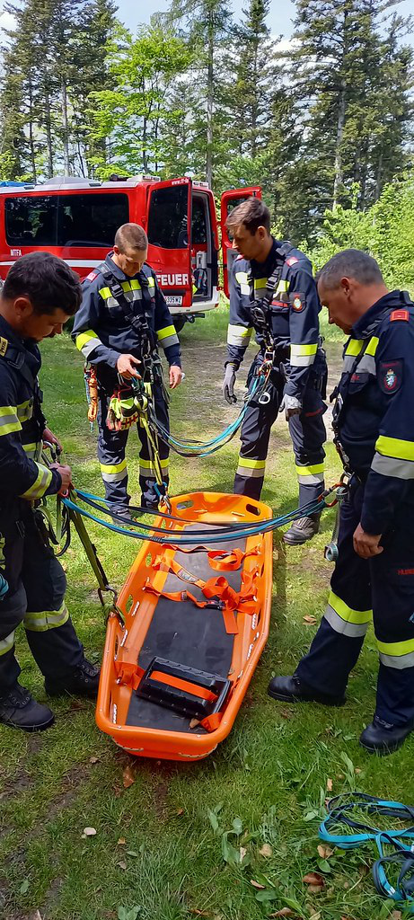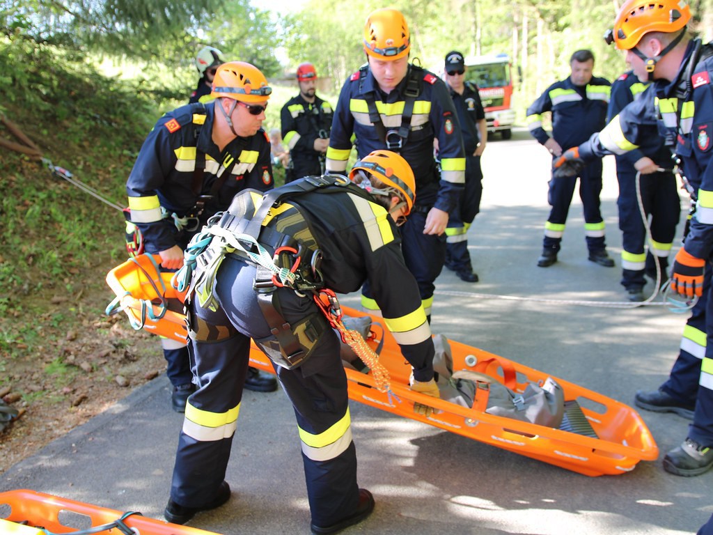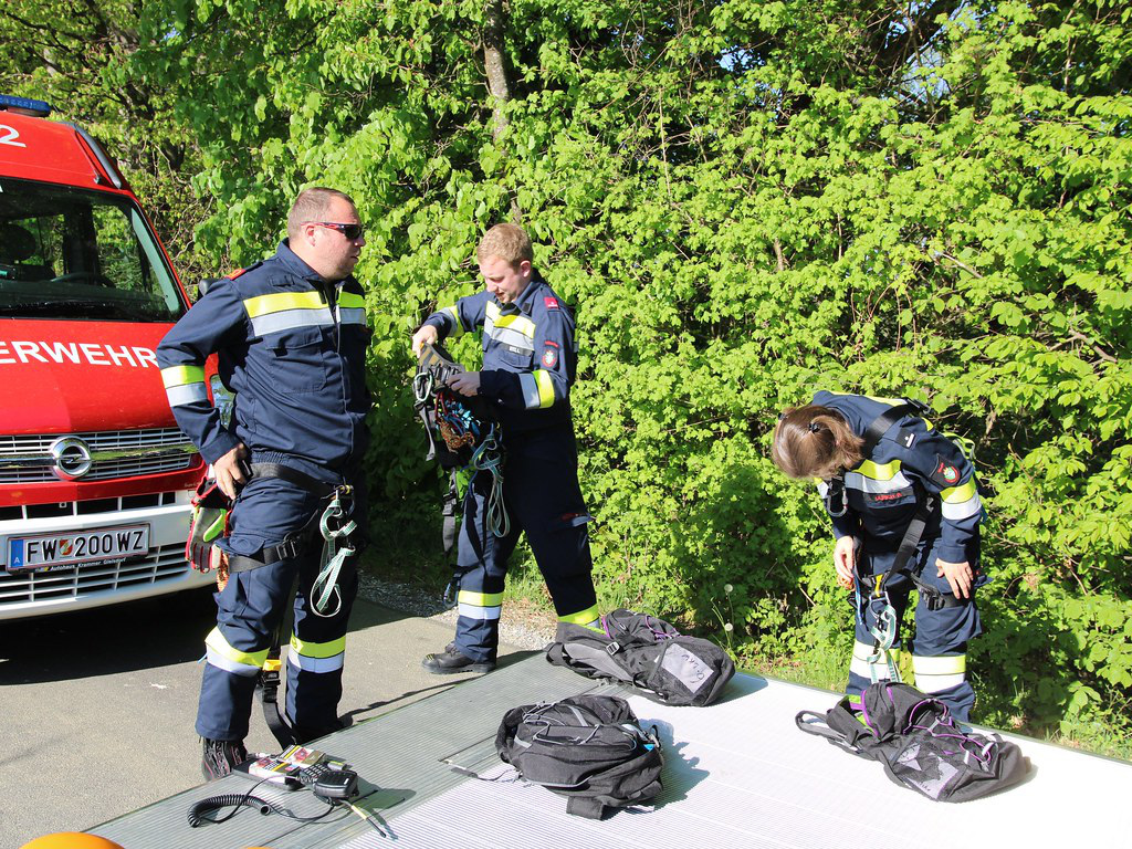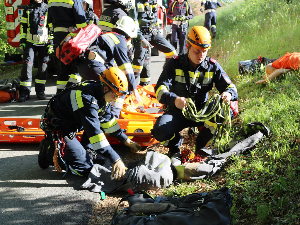 Beide Personen mussten aus dem Fahrzeug gerettet werden und wurden mittels Korbtrage von zwei Feuerwehrmitgliedern über einen Express-Flaschenzug nach oben befördert und an weitere Feuerwehrsanitäter zur Versorgung übergeben.