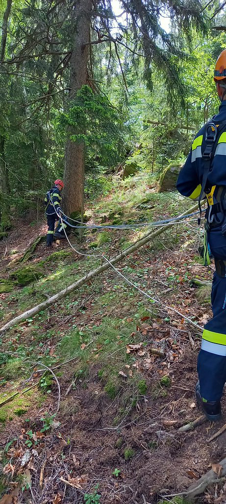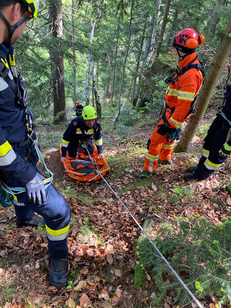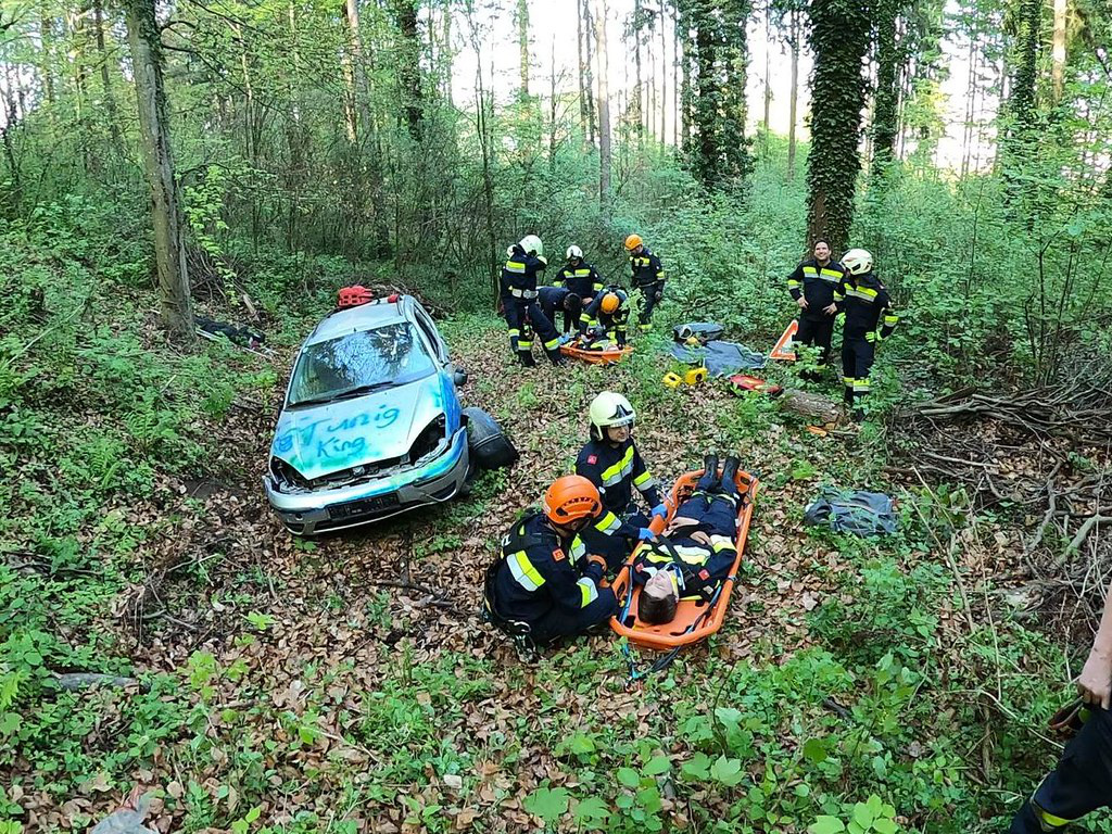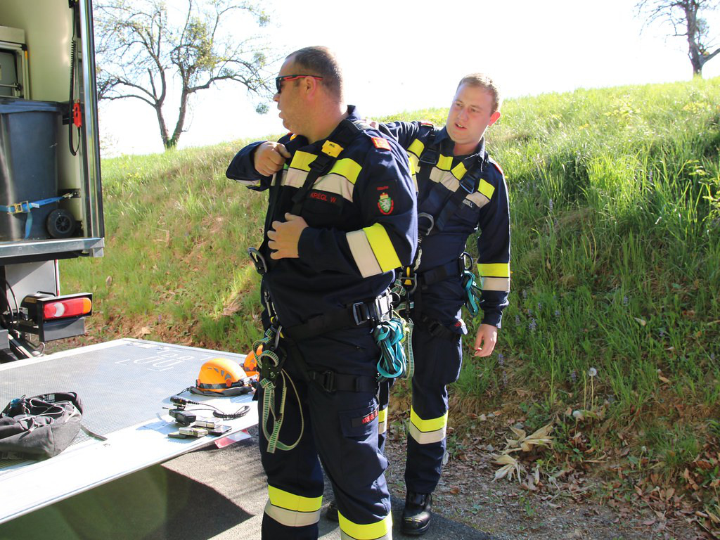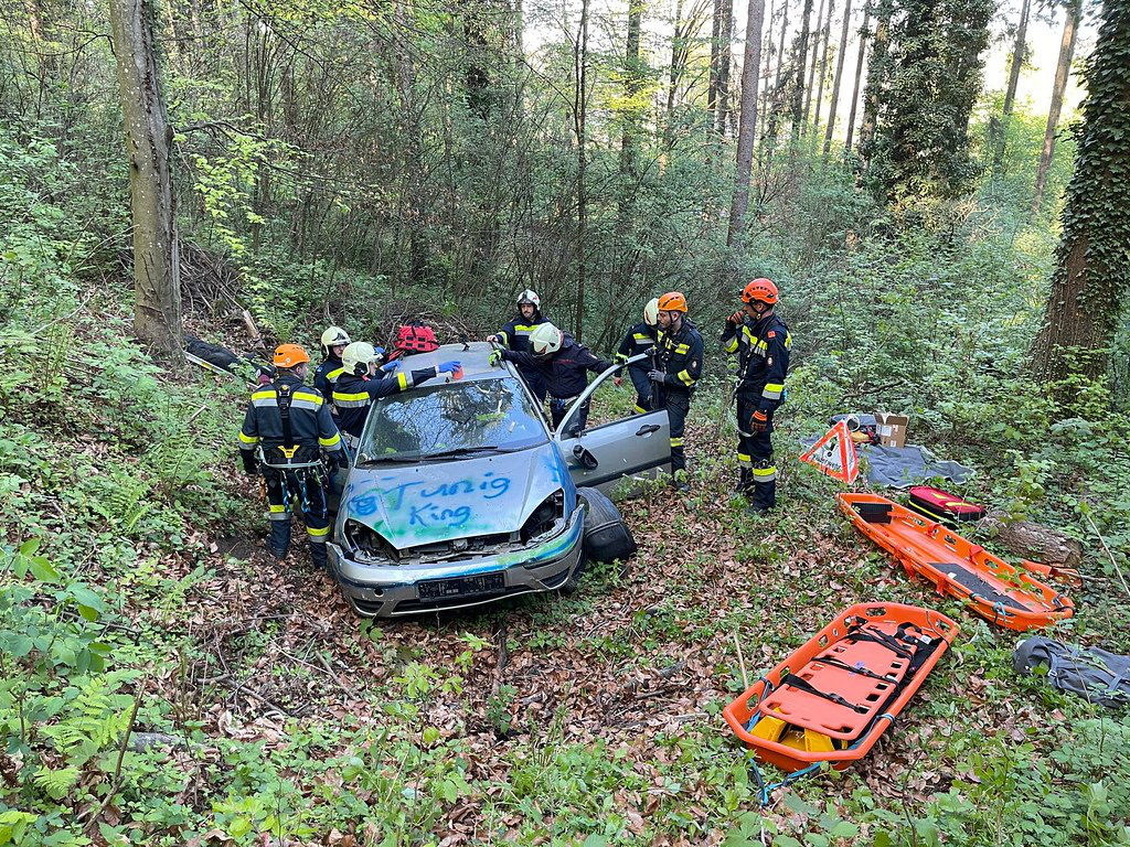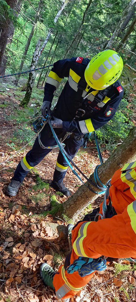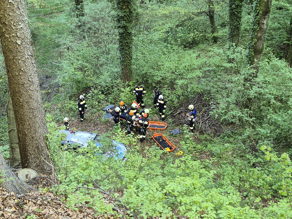 Mithilfe der MRAS-Ausrüstung wurde ein gesicherter Abstieg für die Feuerwehrsanitäter zum verunfallten Fahrzeug hergestellt. Unten angekommen, stellten diese fest, dass sich zwei verletzte Personen im PKW befanden.