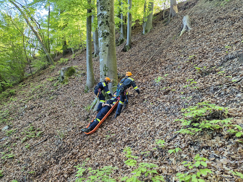 Station 2: Menschenrettung einer Verletzen Person aus dem unwegsamen Gelände mittels Korbtrage