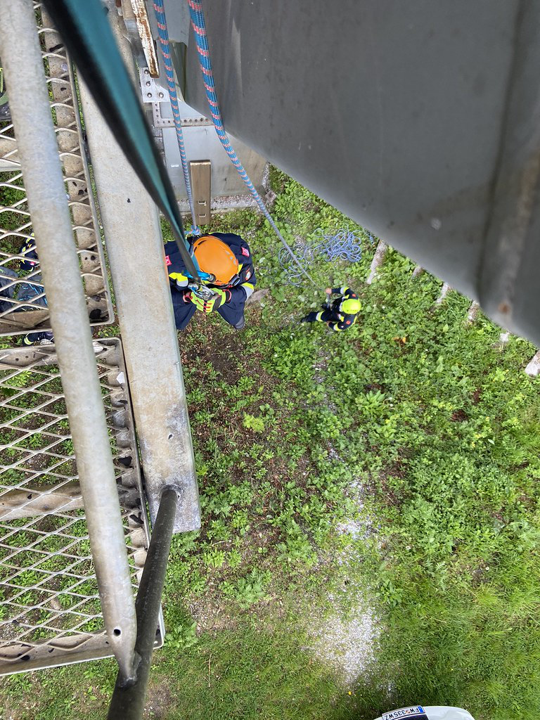 Station 1: Menschenrettung einer in den Auffanggurt gestürzten Person von einer Säule der Liftanlage.