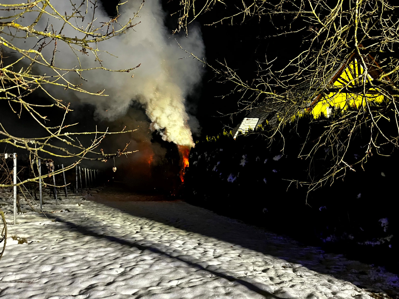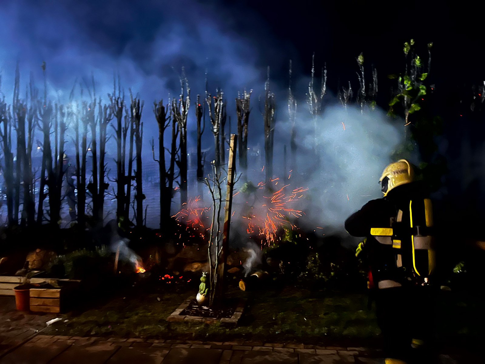 Tätigkeit: Einsatzstelle absichern, Hecke mittels HD- und zwei C-Rohren löschen, eine Zubringleitung von einem ca, 1oo Meter entferntem Hydranten zum HLF legen, schützen vom angrenzendem Wohnhaus und Gartenhaus, und mittels Wärmebildkamera prüfen