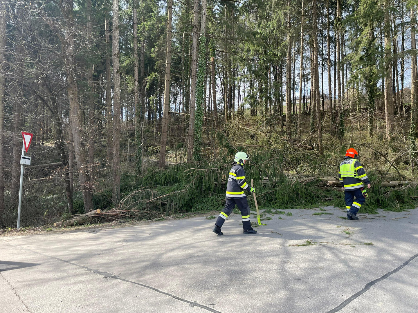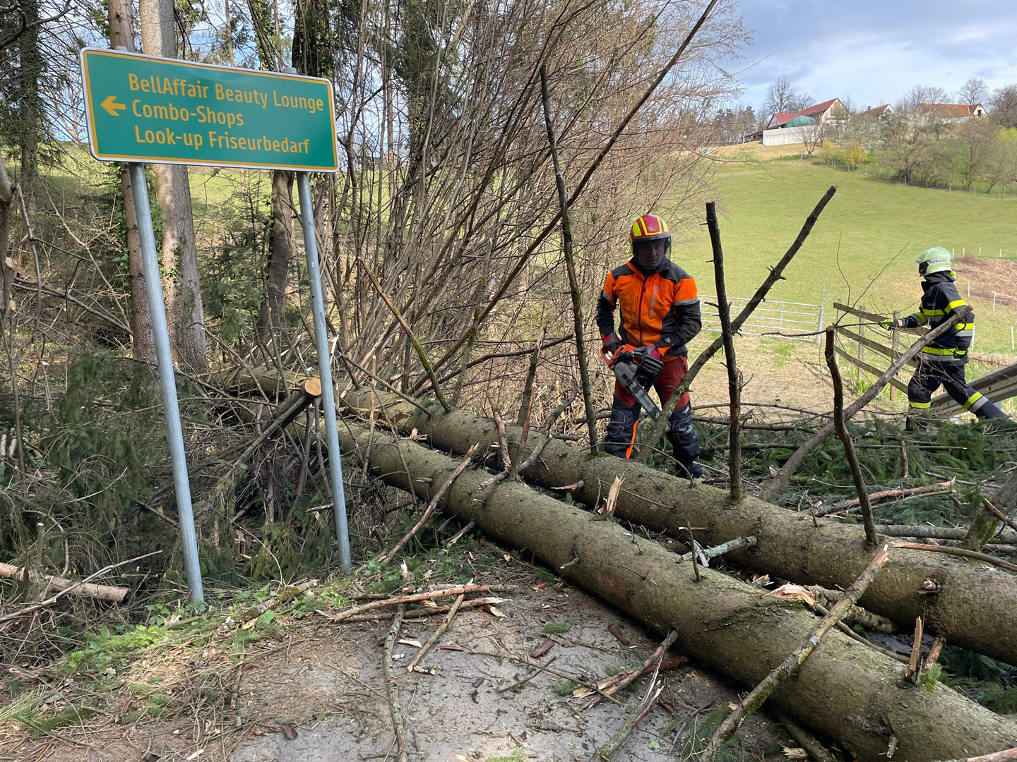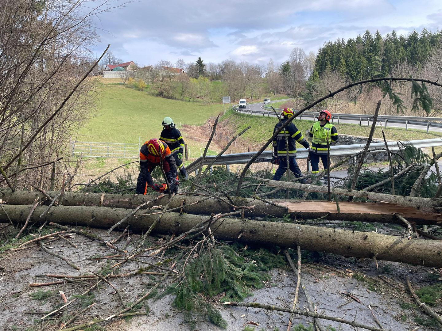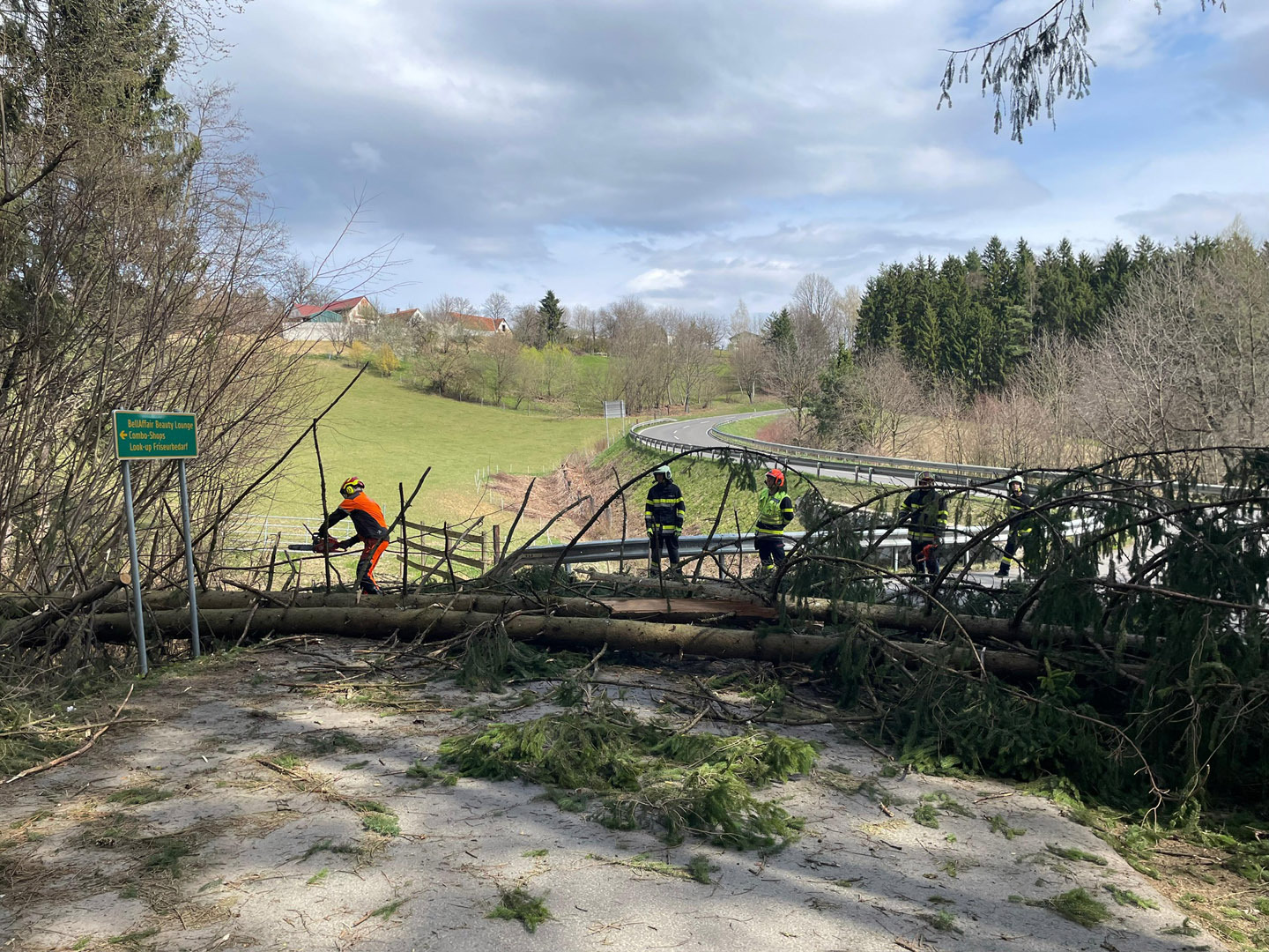 Tätigkeit: Einsatzstelle absichern, Bäume mittels Motorkettensäge von der Straße entfernen, Straße reinigen und die Straße mittels Gemeinde bis auf weiteres sperren