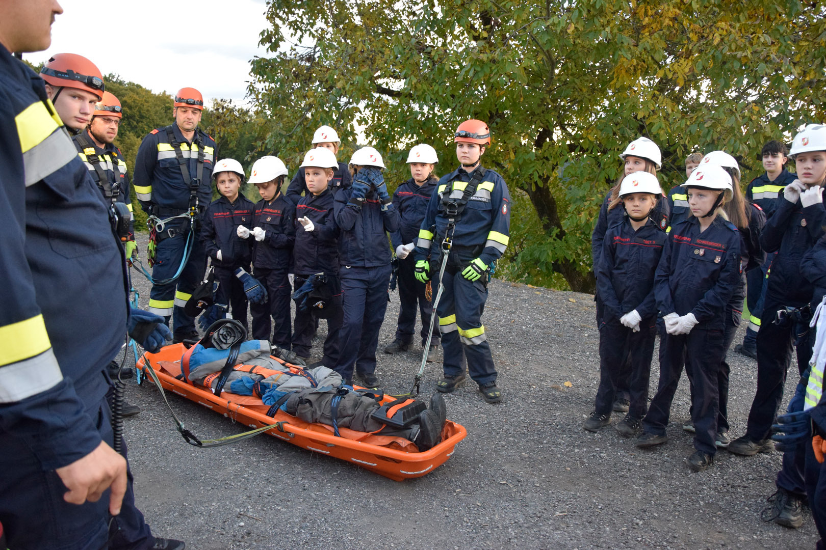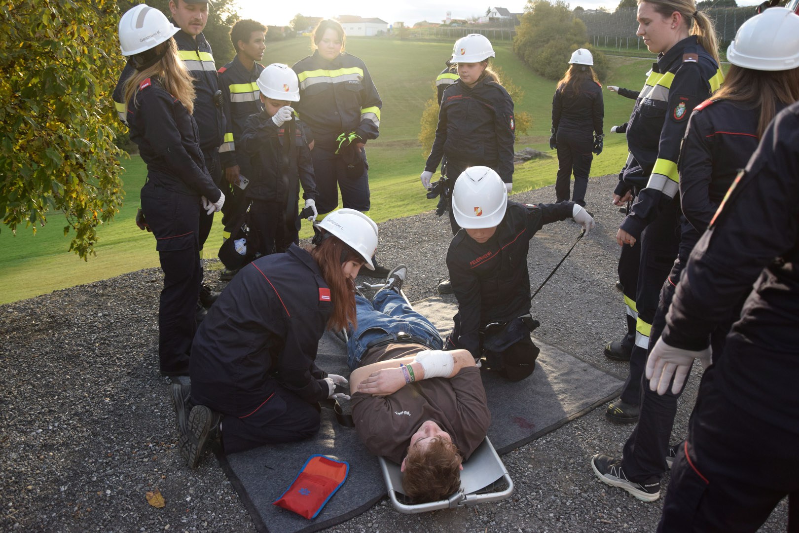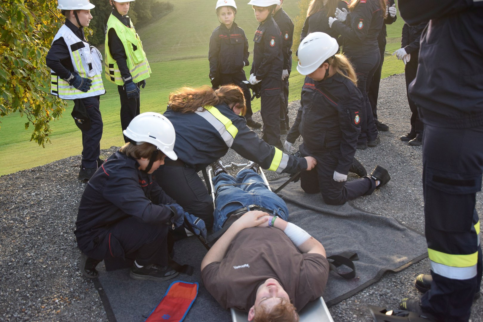 Die Übungsannahme war ein Mopedunfall mit mehreren verletzten Personen. Nach der Erkundung durch den Übungseinsatzleiter stellte sich heraus, dass eine Person in unwegsames Gelände geraten war, eine weitere einen medizinischen Notfall erlitt und reanimiert werden musste. Der Beifahrer war unter dem Moped eingeklemmt und erlitt eine Verletzung an der Hand. Zudem musste ein geschockter Passant beruhigt und seine leichten Verletzungen versorgt werden.