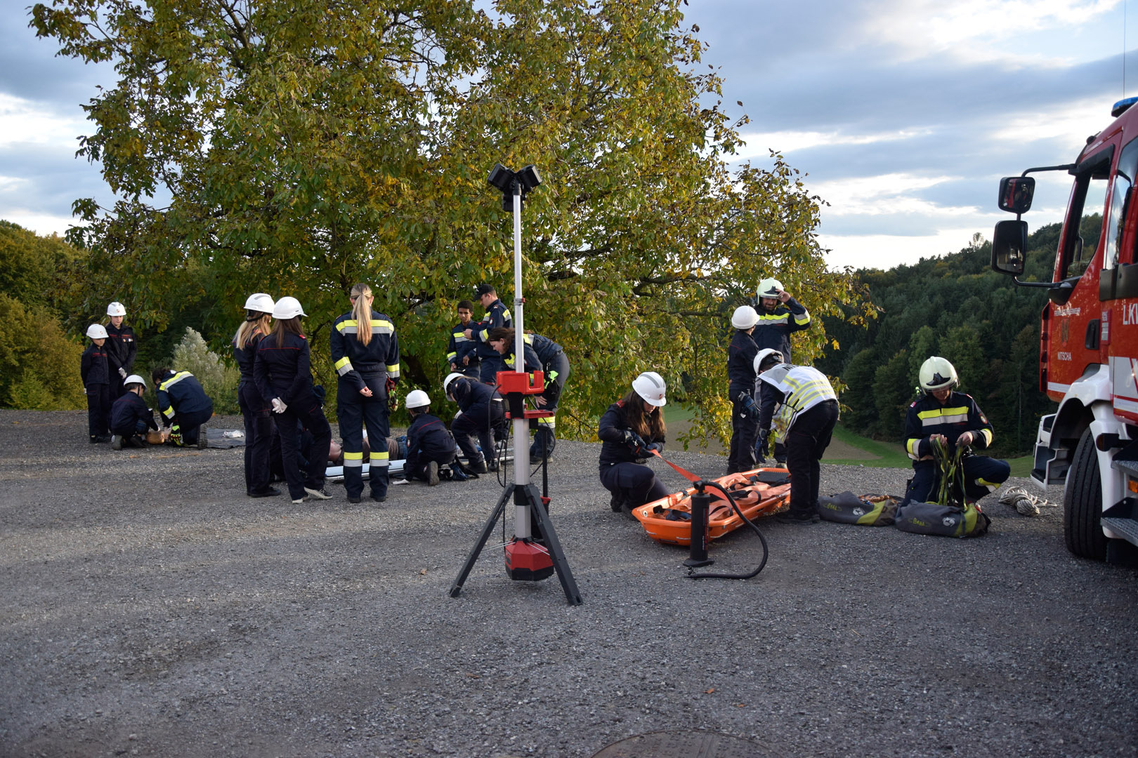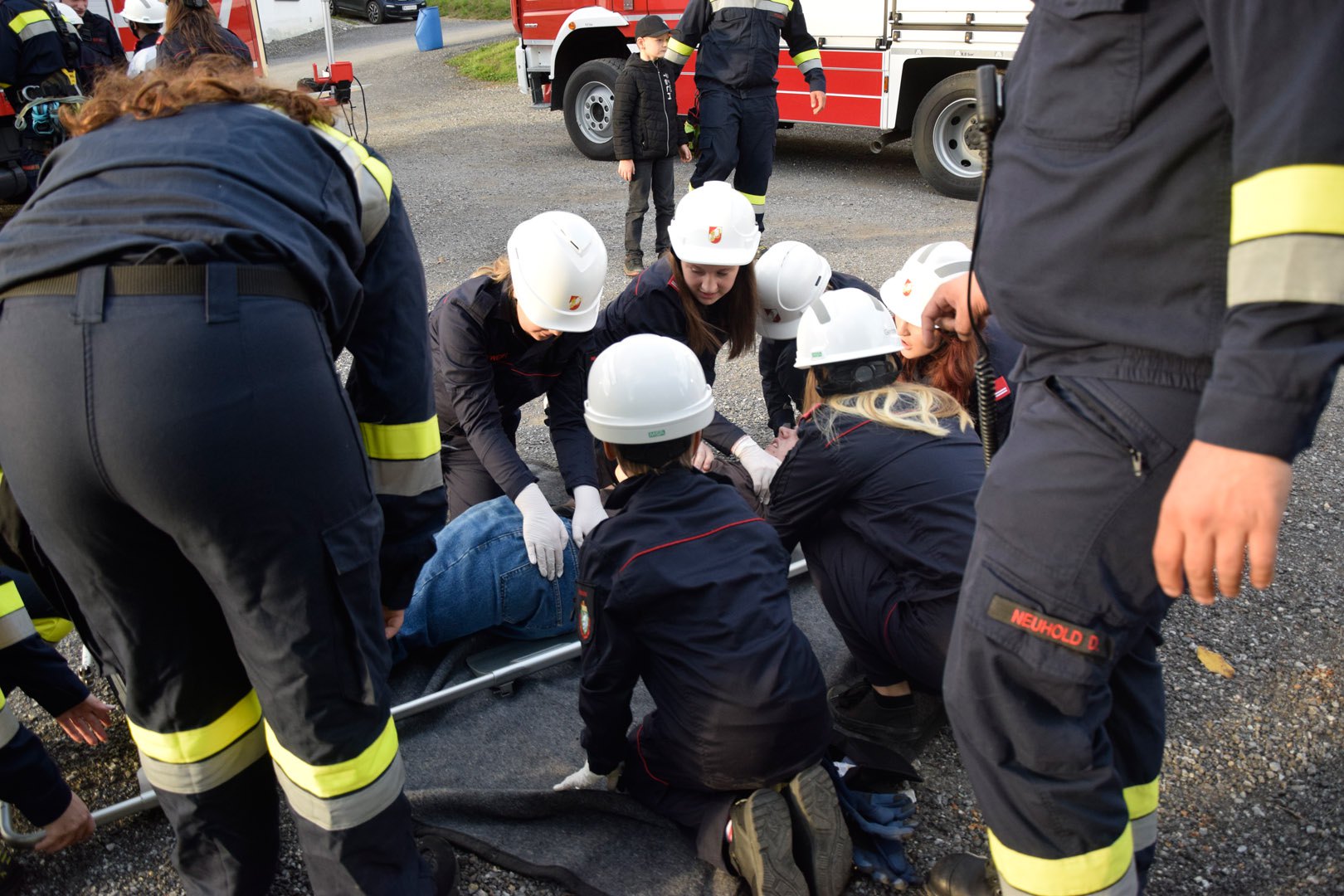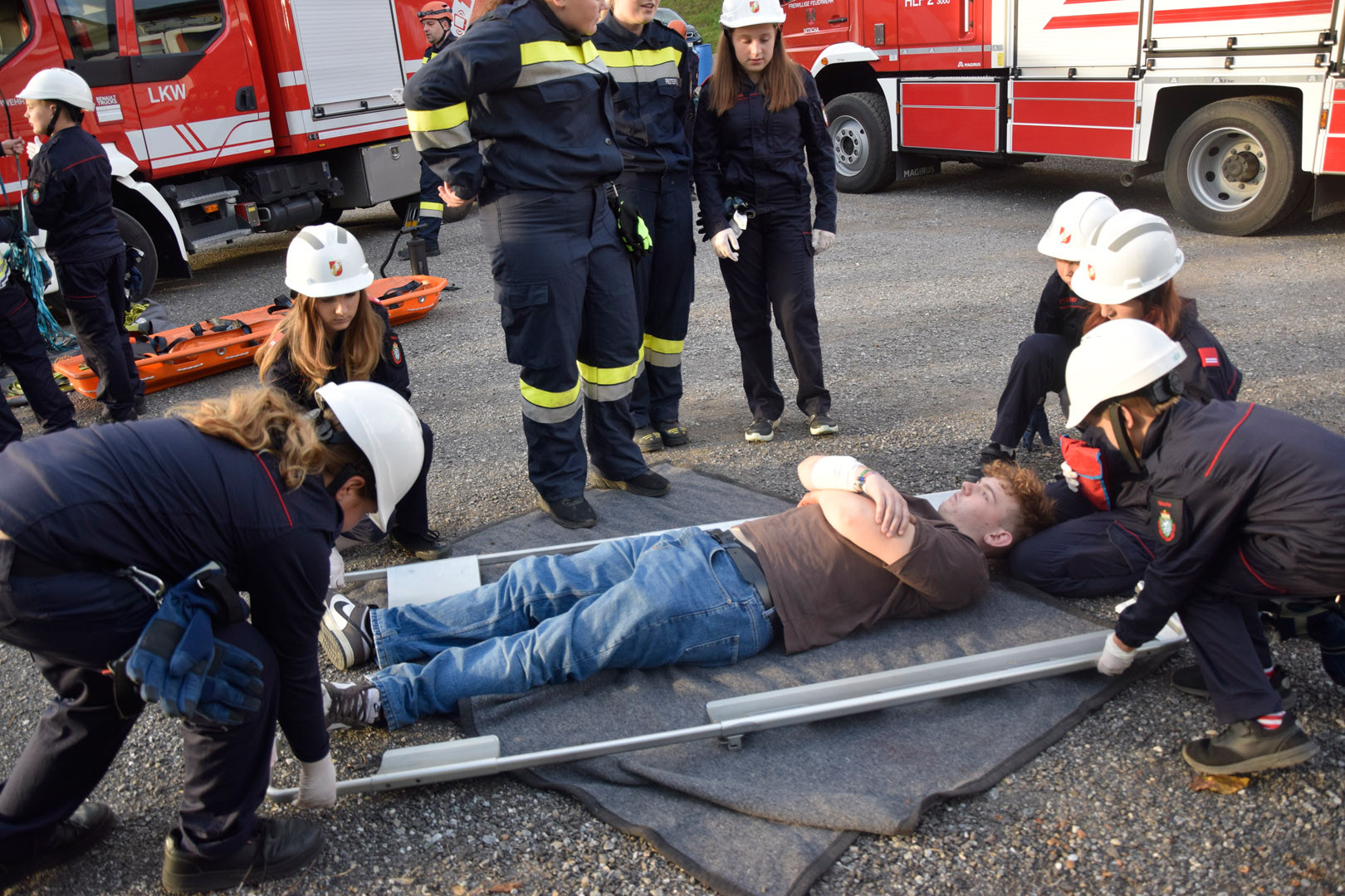 Die Übungsannahme war ein Mopedunfall mit mehreren verletzten Personen. Nach der Erkundung durch den Übungseinsatzleiter stellte sich heraus, dass eine Person in unwegsames Gelände geraten war, eine weitere einen medizinischen Notfall erlitt und reanimiert werden musste. Der Beifahrer war unter dem Moped eingeklemmt und erlitt eine Verletzung an der Hand. Zudem musste ein geschockter Passant beruhigt und seine leichten Verletzungen versorgt werden.