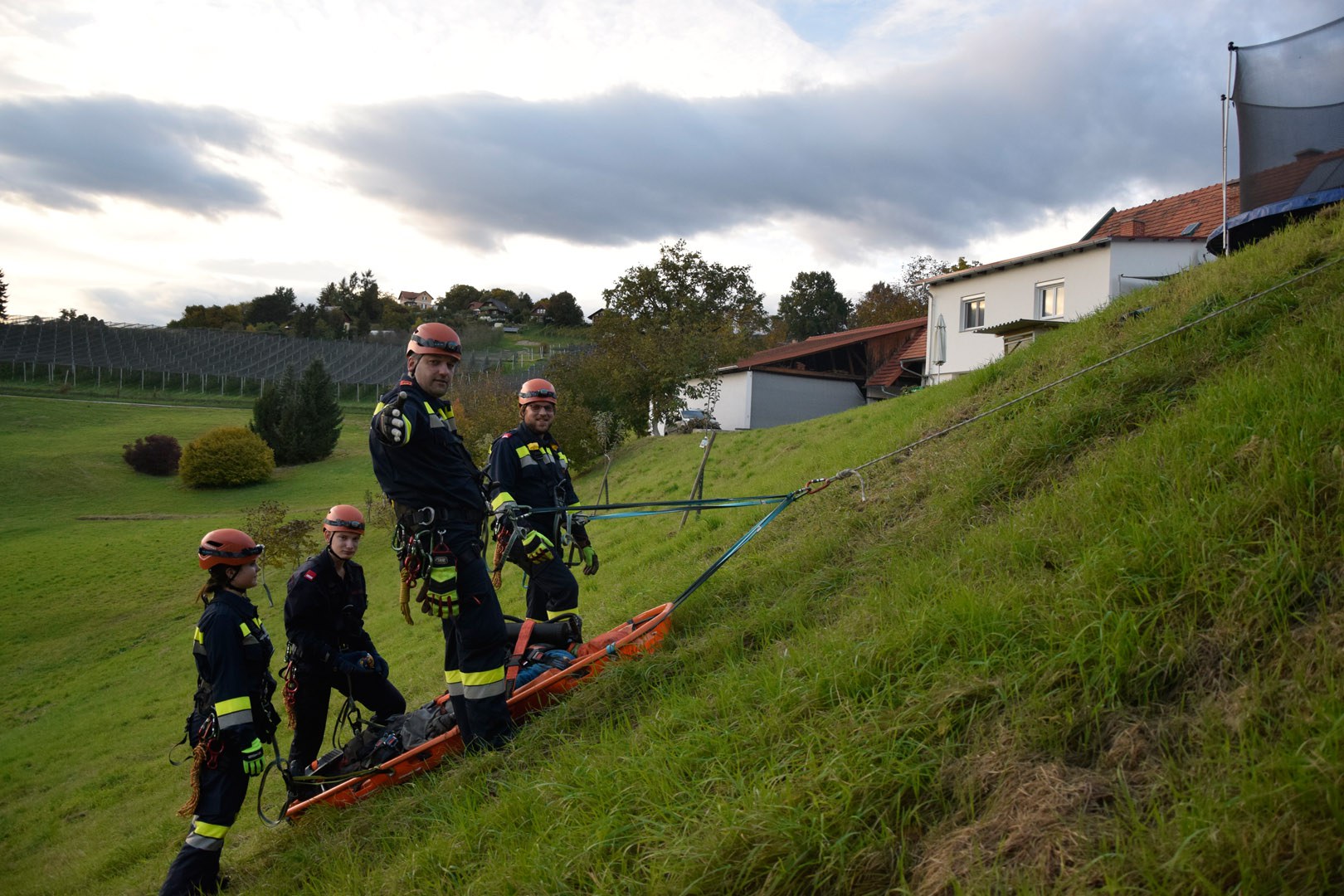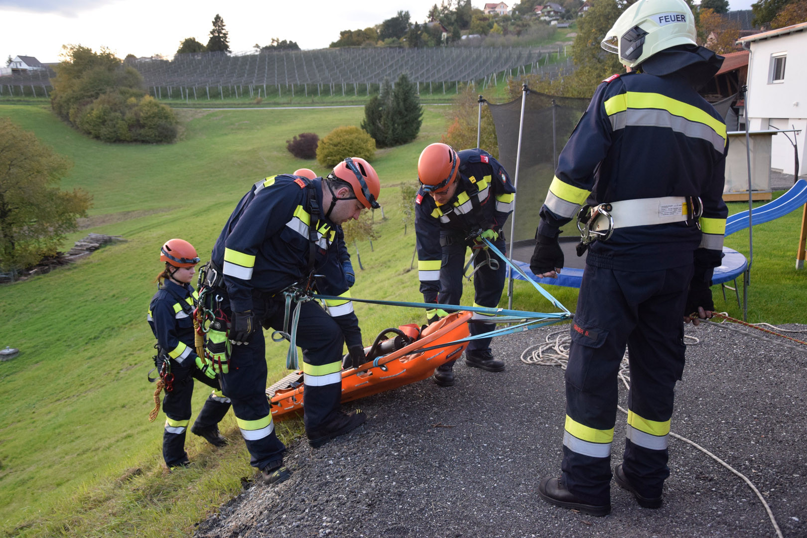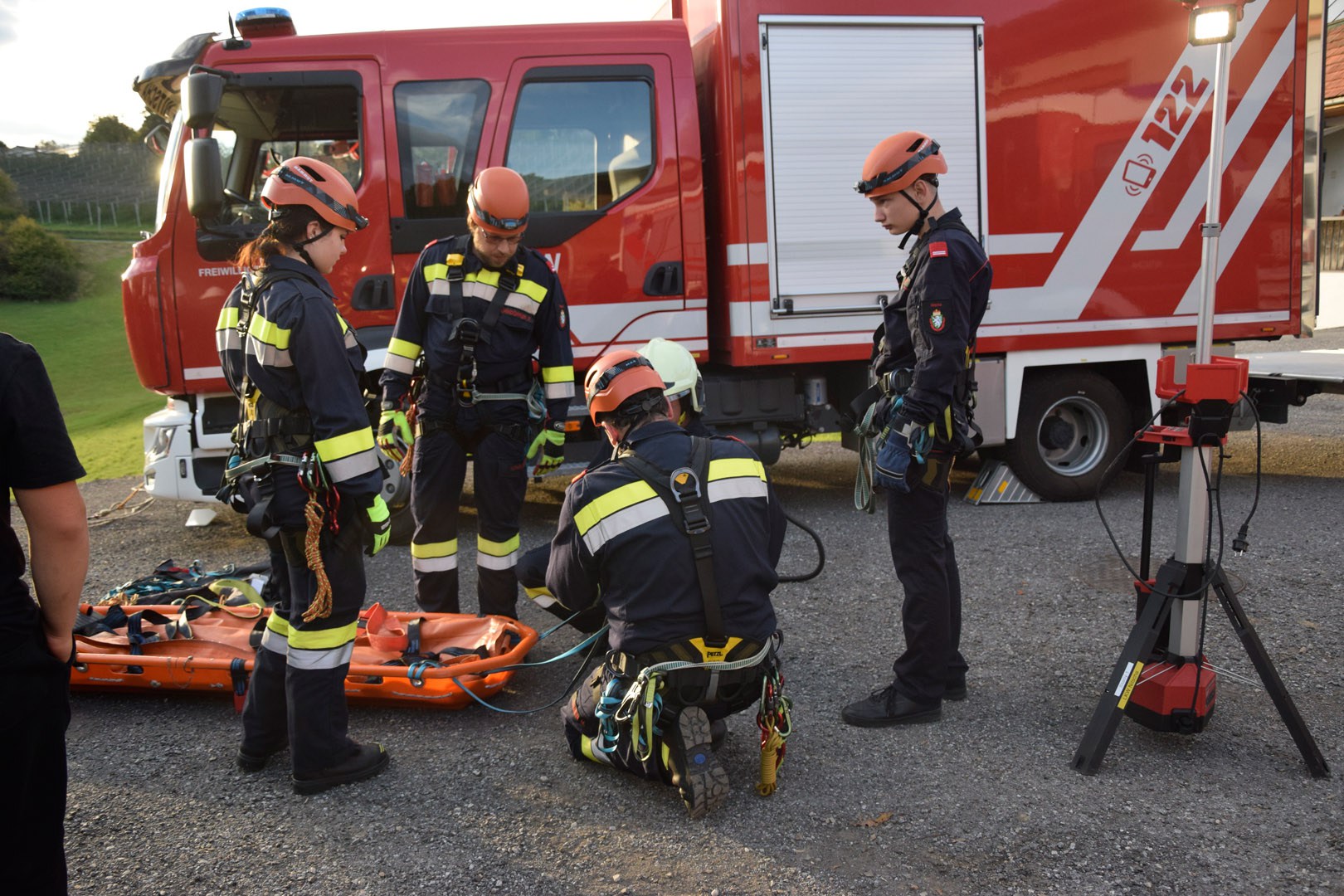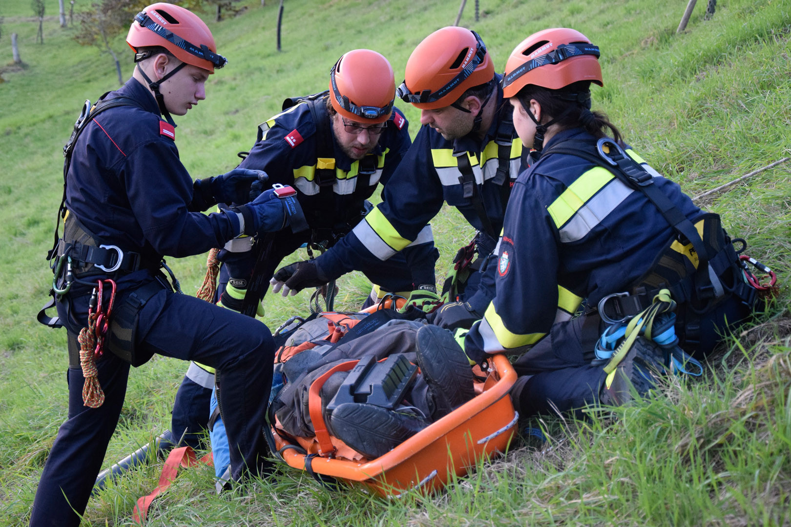 Die Rettung der verunglückten Person im unwegsamen Gelände erfolgte mithilfe von MRAS (Menschenrettung und Absturzsicherung), einer Korbtrage und einer Vakuummatratze.