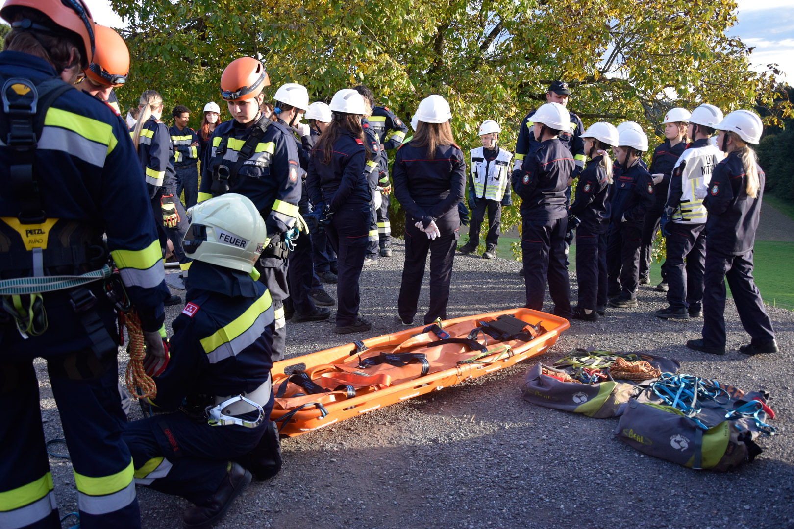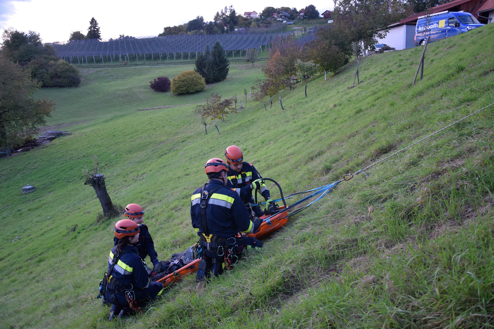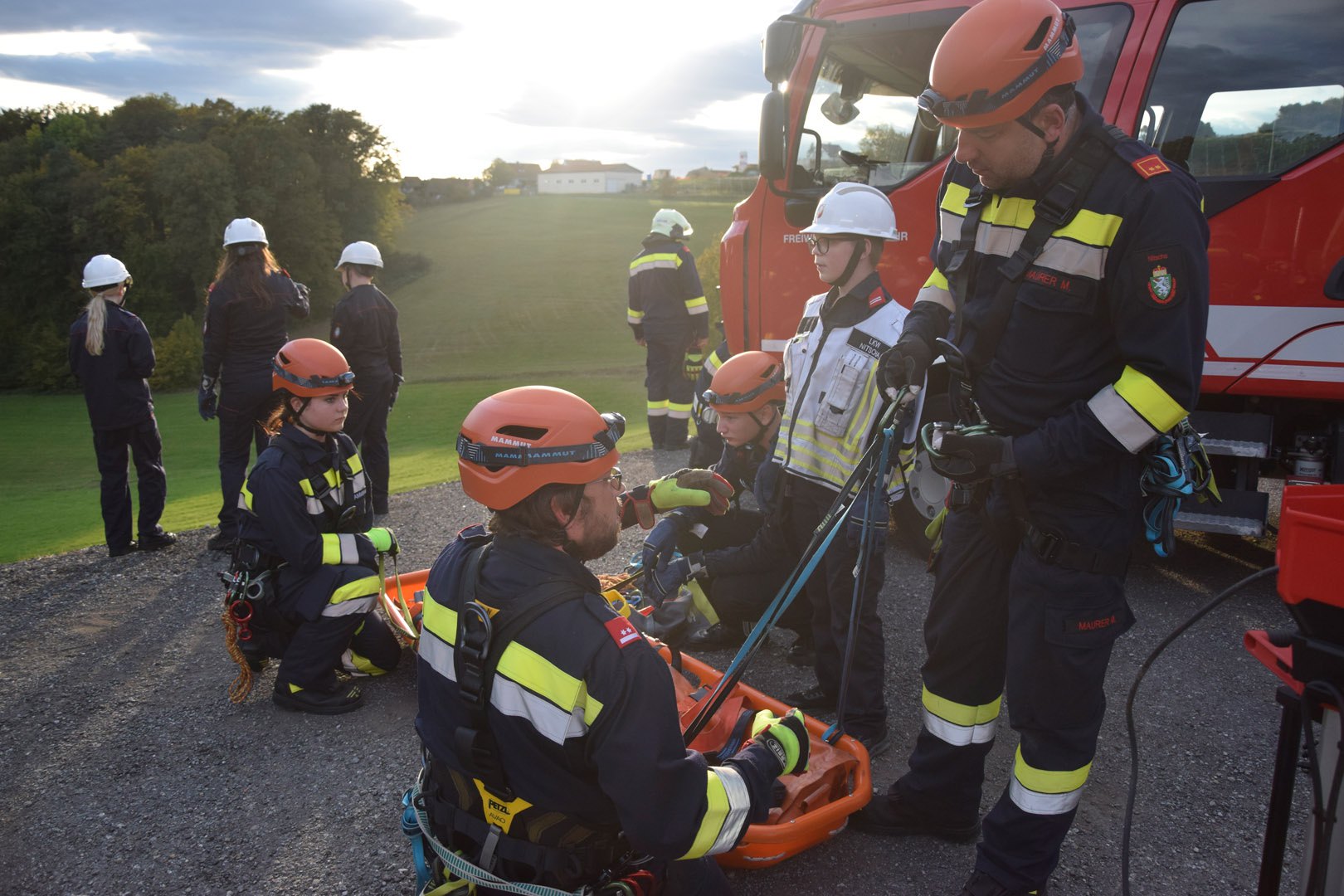 Die Rettung der verunglückten Person im unwegsamen Gelände erfolgte mithilfe von MRAS (Menschenrettung und Absturzsicherung), einer Korbtrage und einer Vakuummatratze.