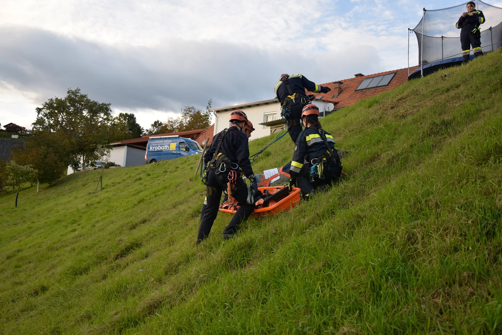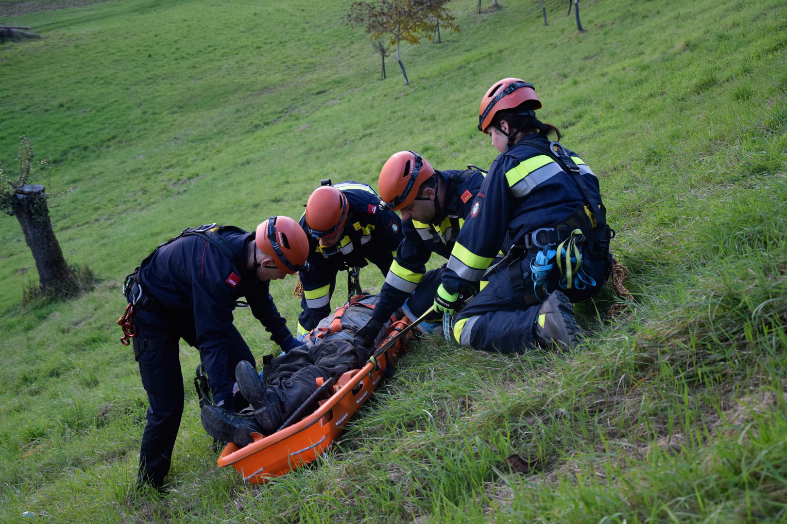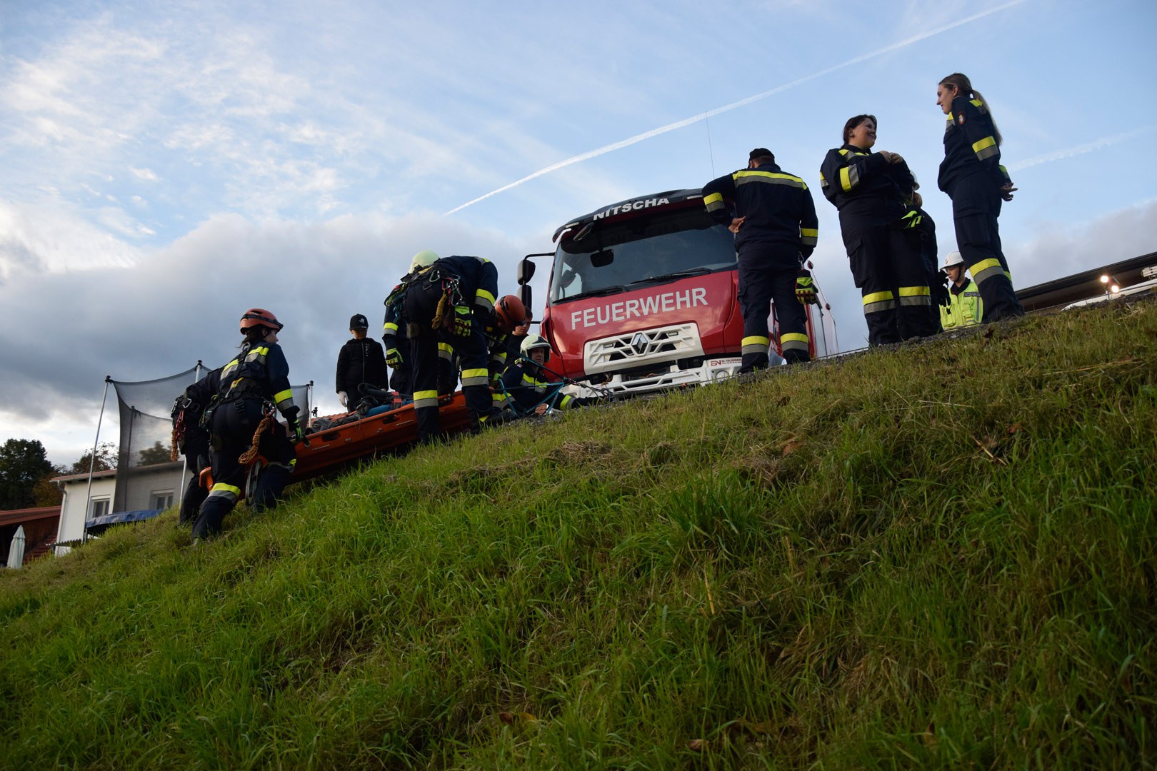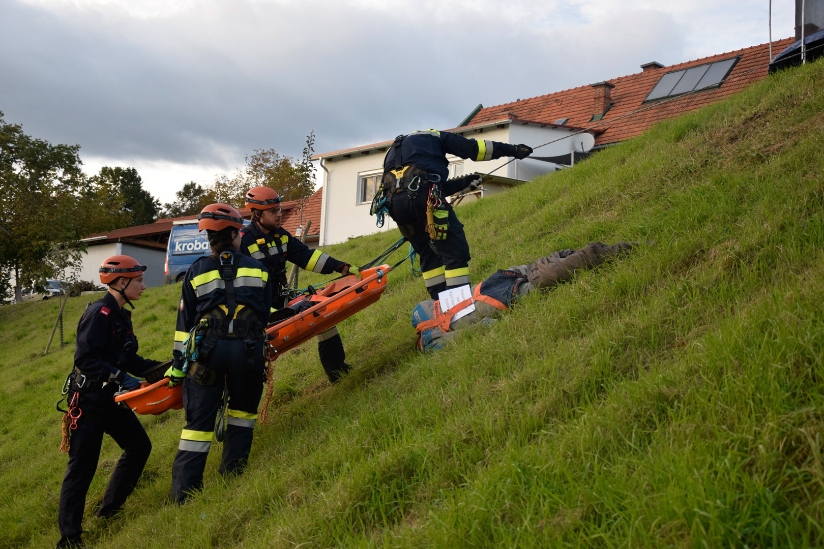 Die Rettung der verunglückten Person im unwegsamen Gelände erfolgte mithilfe von MRAS (Menschenrettung und Absturzsicherung), einer Korbtrage und einer Vakuummatratze.