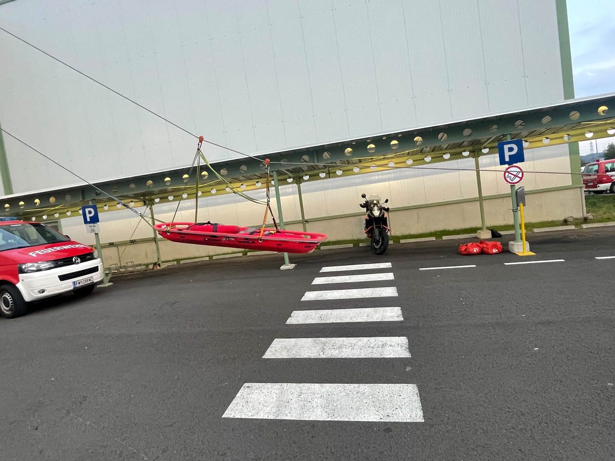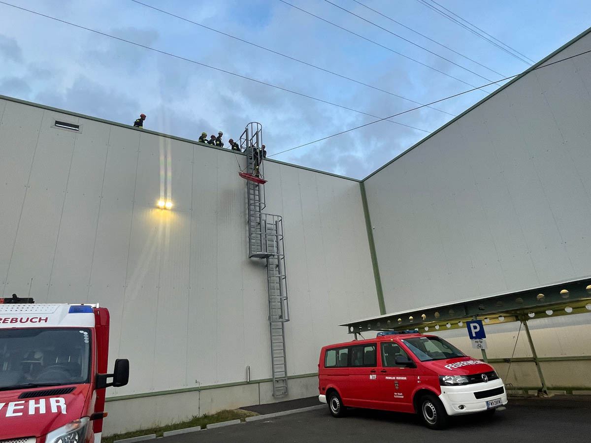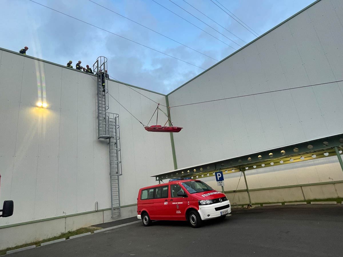 Unser MRAS Trupp bestehend aus OBI Markus Maurer, OLM d. V. Stefan Zink und LM d. F. Lukas Meißl beübten mit weiteren Kameraden aus dem Abschnitt Gleisdorf, unter der Leitung von HLM Bernhard Genser (FF Nitscha), eine Menschenrettung mittels Korbtrage und Seiltechnik vom Hallendach der Firma Magna.