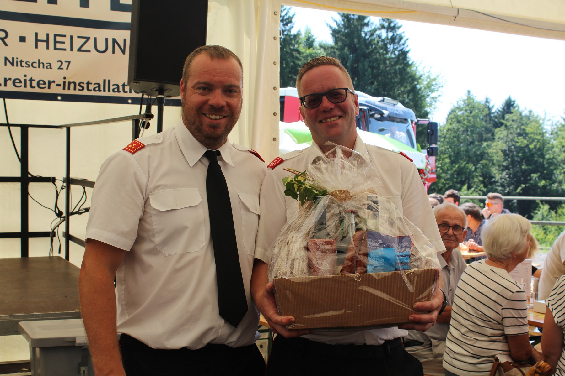 Bevor es zur Fahrzeugsegnung ging, wurde noch der Fahrzeugausschuss vor die Bühne gebeten. Diese waren OBI Markus Maurer, ABI Rudi Karrer, HBM Martin Wilfling, BM Christian Prenner, HLM Thomas Gerstmann und LM Patrick Schlenner. HBI Werner Kriegl übergab allen ein Geschenkskorb als Dank für die gute Zusammenarbeit. Als Überraschung lies OBI Markus Maurer alle Feuermitglieder der FF Nitscha vor die Bühne aufmarschieren, Werner Kriegl war sichtlich sehr gerührt und bekam einen Bierkorb überreicht.